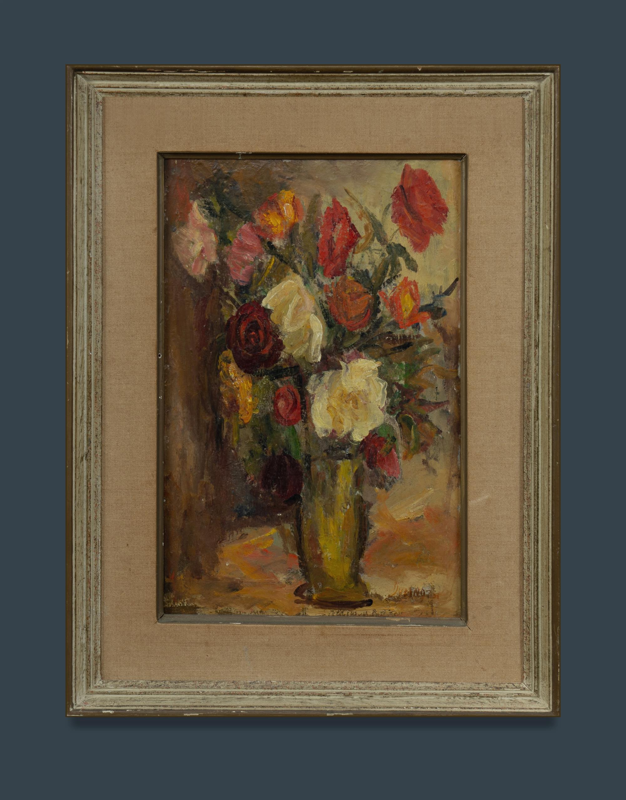 DYRING, Moya (1908-1967) 'Roses,' 1961. Signed and dated lower right. Titled verso. Oil on Board 39.5x25.5cmEstimate $600-900