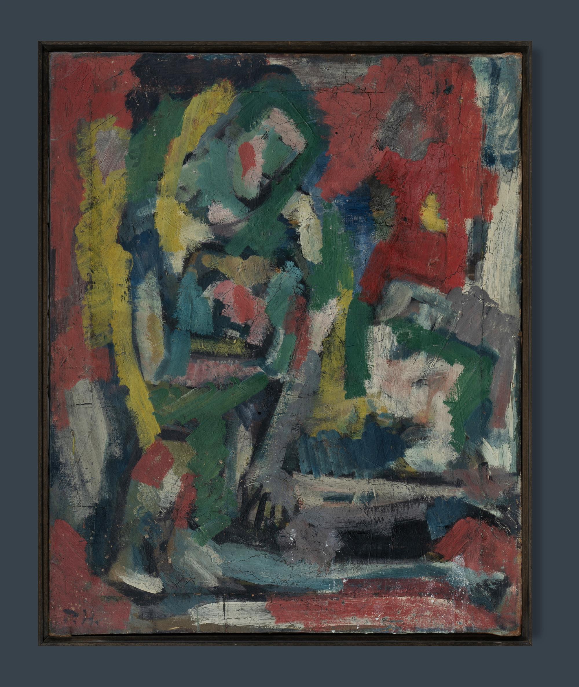 HAEFLIGER, Paul (1914-1982) Abstract Figure, c.1954. Initialled 'PH' lower left. Old inscription verso. Oil on Canvas 68x55.5cmEstimate $600-1,000