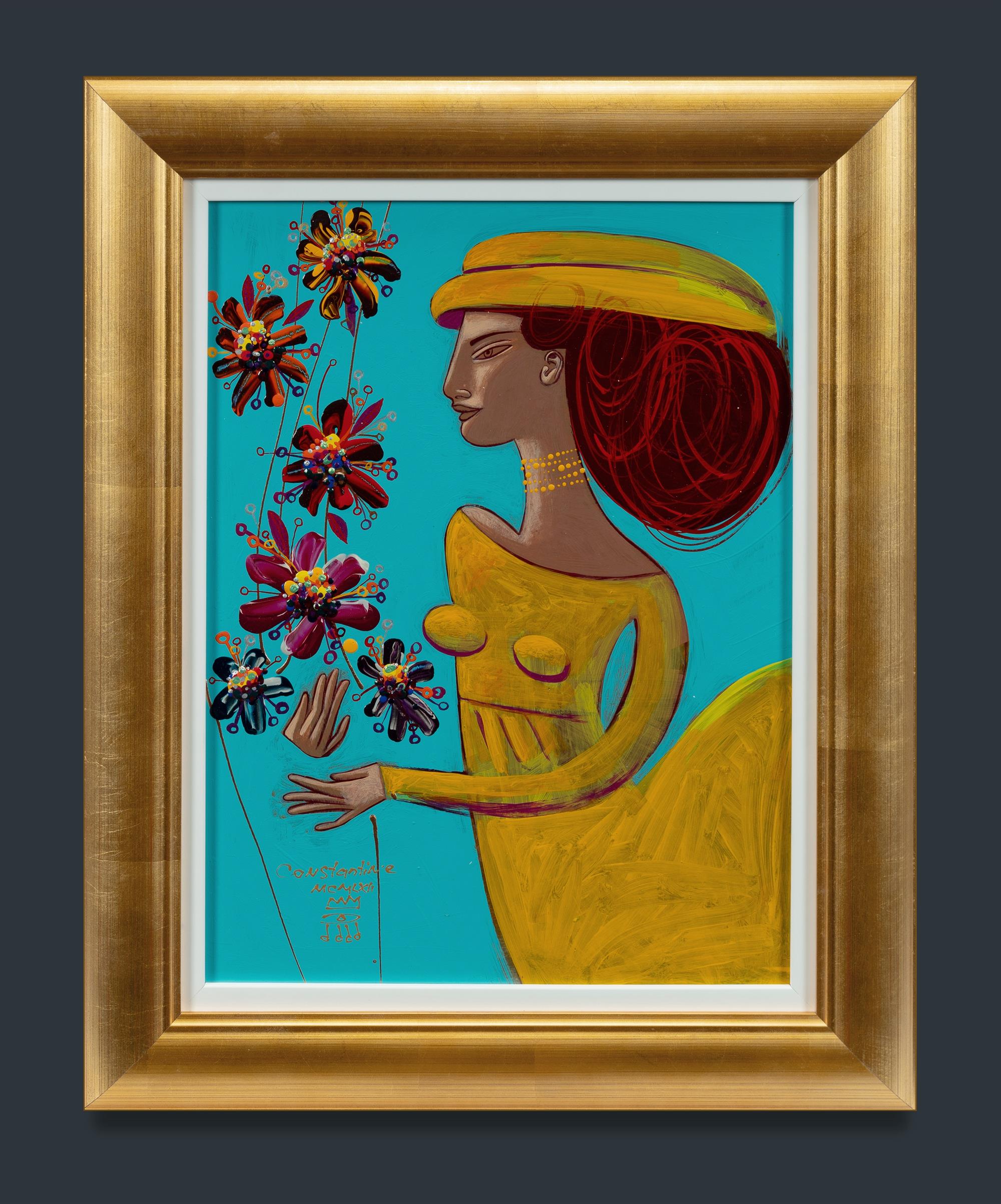POPOV, Constantine (Swiss/Australian b.1962) Woman in Yellow with Flowers, 2022. Well inscribed verso. Acrylic on Board 40x30cmEstimate $350-550