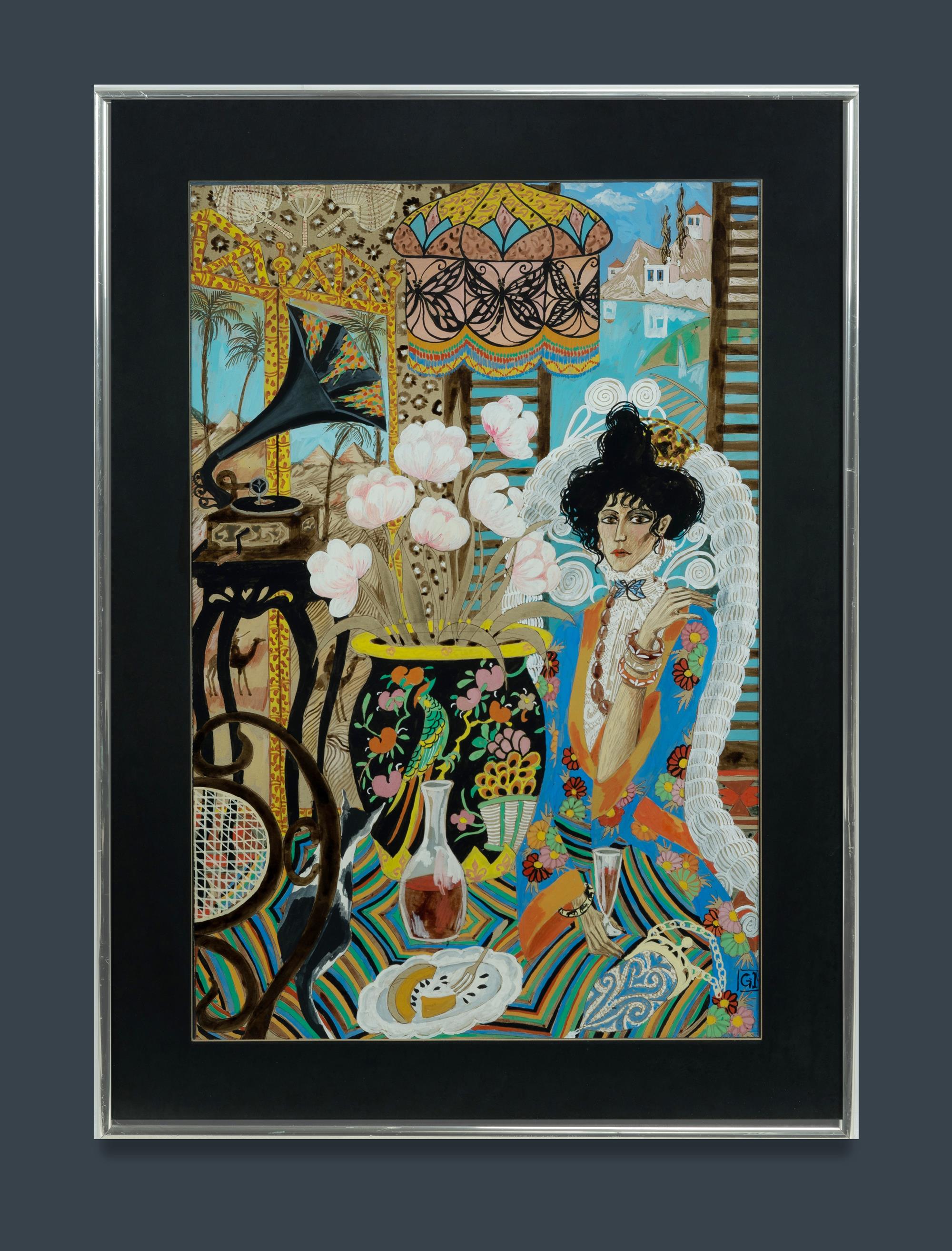 IRVINE, Greg (b.1947) An Afternoon with Music, Wine and Honeydew Melon. Gouache 74x48cmEstimate $400-600