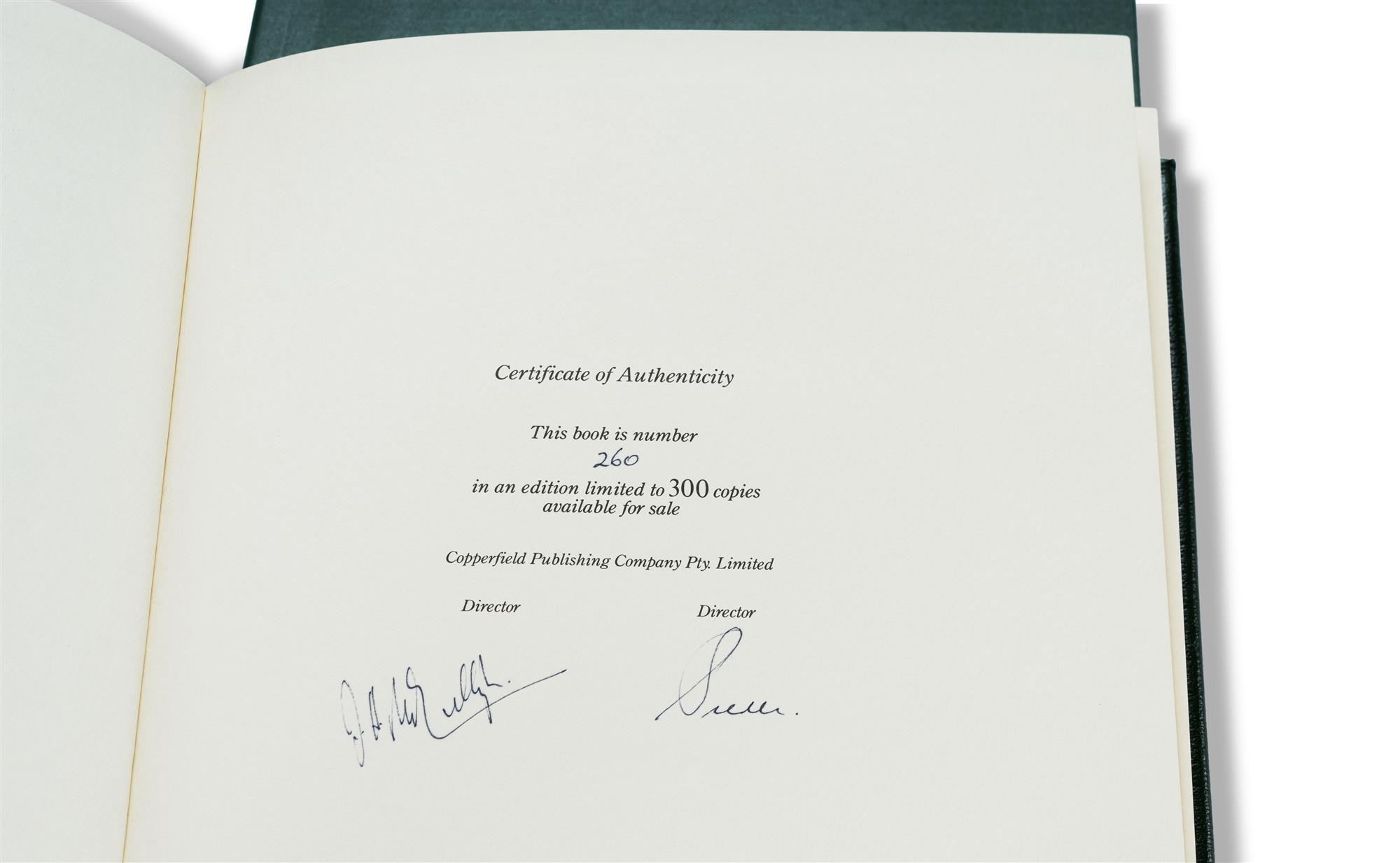 BOOK: 'The Art of Sir Lionel Lindsay,' Volume I: Woodcuts. Edition 260/300. Joanna Mendelssohn, pub Copperfield 1982. Signed by two directors. Leather bound edition with slipcase.Estimate $300-500