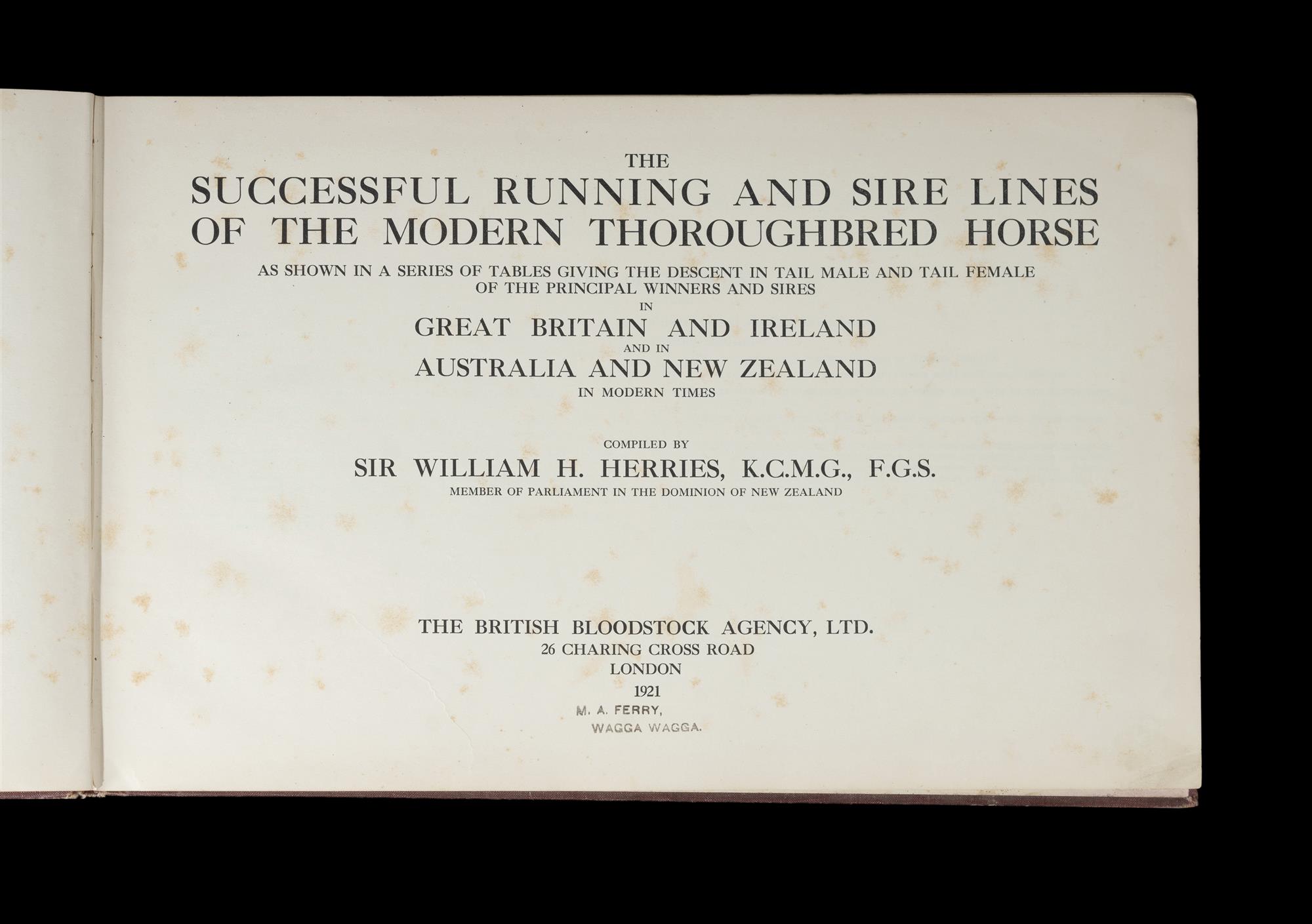 BOOK: 'The Successful Running and Sire Lines of the Modern Thoroughbred Horse' Compiled by Sir William H. Herries, London, 1921.Estimate $100-200