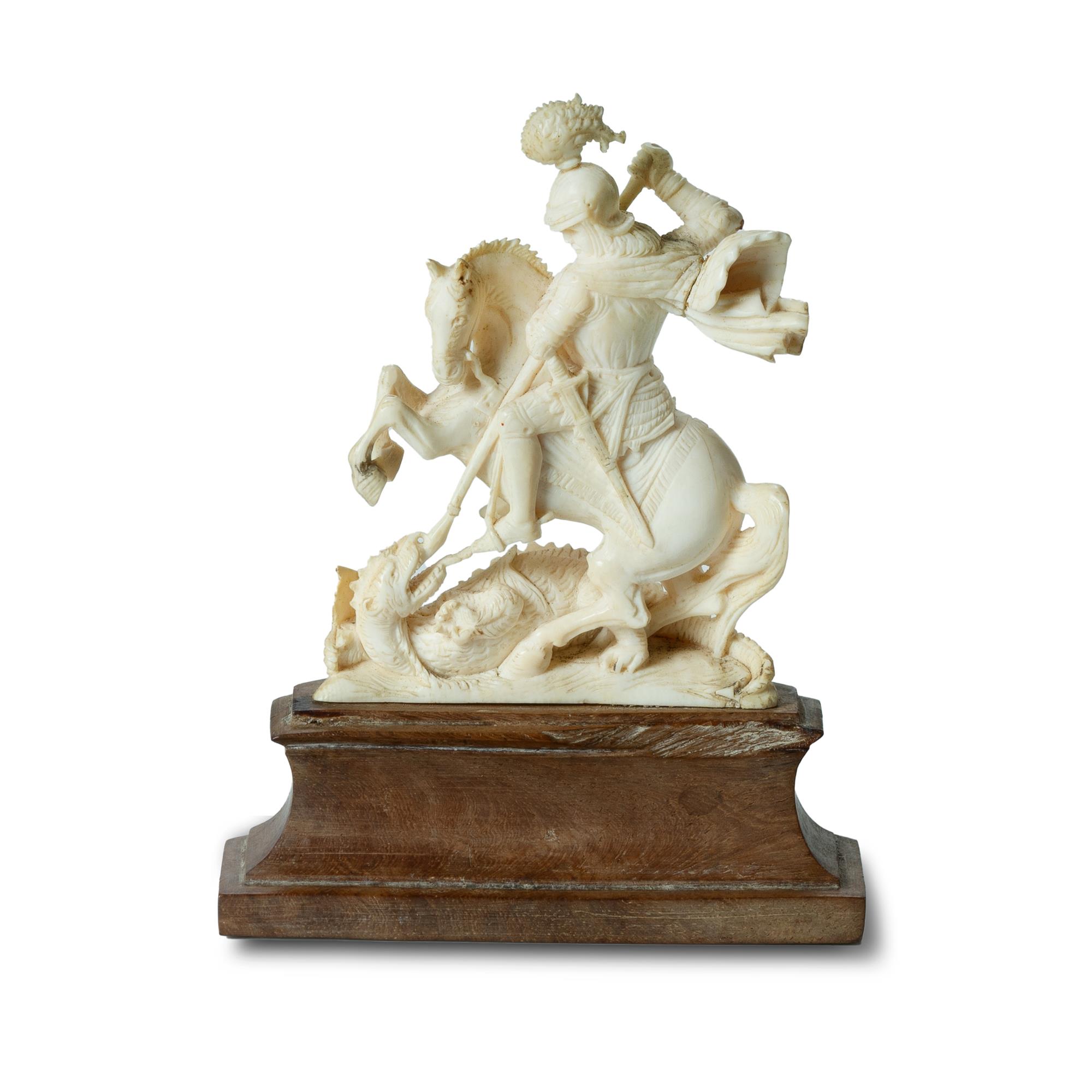 19th C Ivory Carving of St George Slaying a Dragon. On a wooden base. NB: ivory export restrictions. (H11cm total)