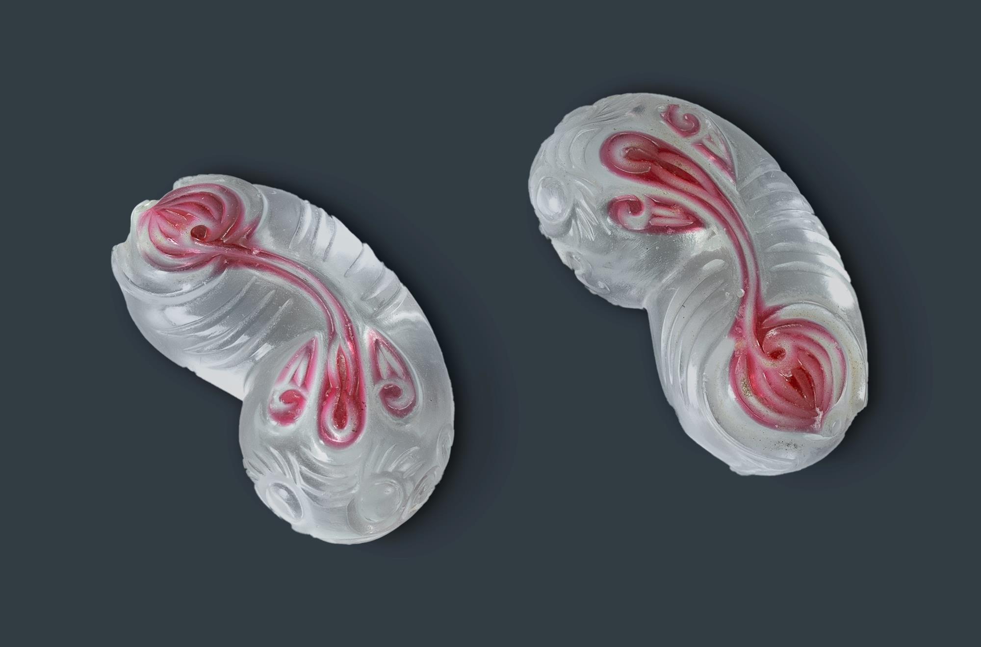 Pr Chinese Peking Glass Carvings. Modelled as Shishi Dogs. Red over clear glass. (L5.5cm each) PROVENANCE: Estate Late Prue Socha, Sydney.Estimate $50-100