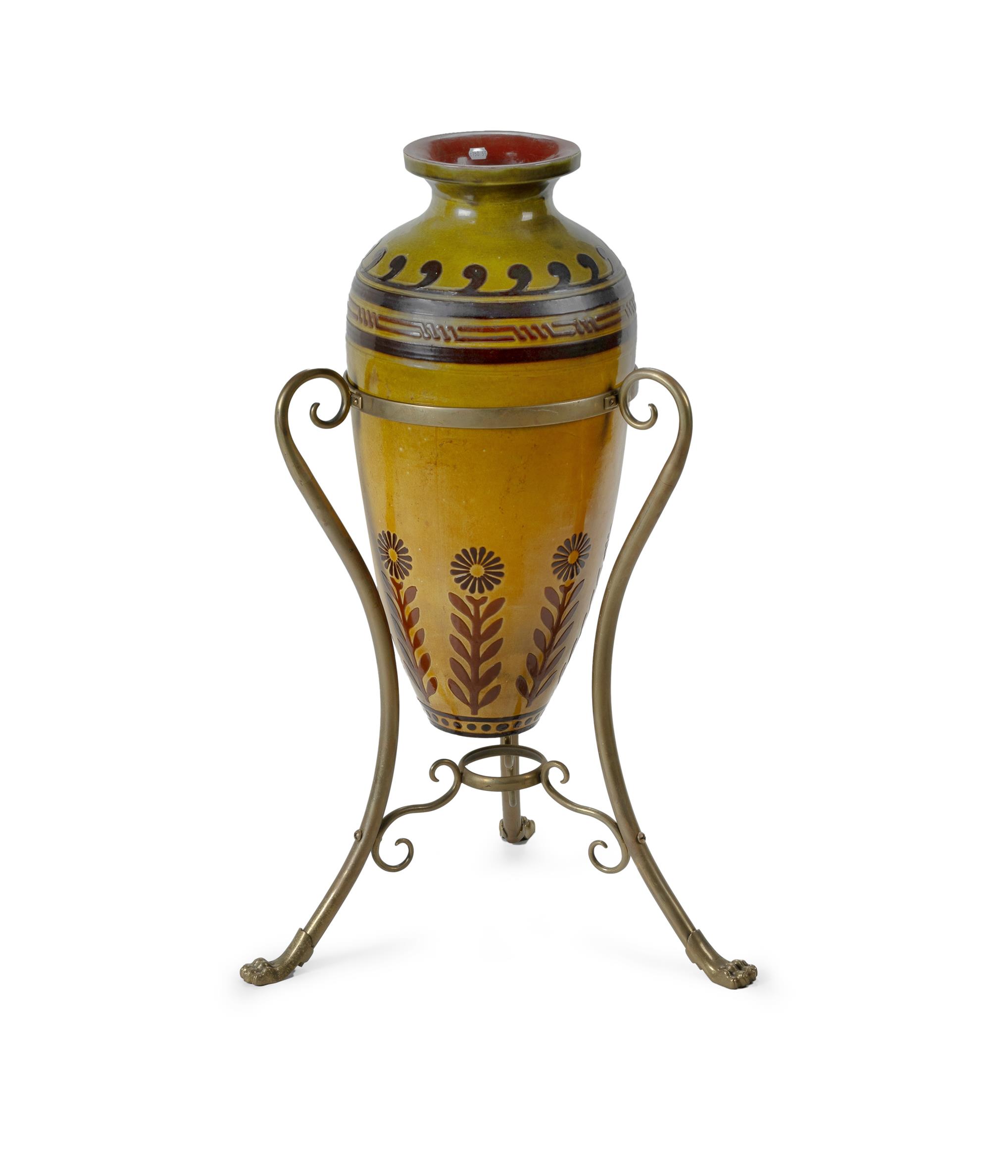 English Aesthetic Movement Slip Decorated Amphora Floor Vase. In brass stand c.1880, in the style of E.W. Godwin and Christopher Dresser. Green, red and yellow colourway. Includes cone shaped base (separated) (H80cm)Estimate $300-600