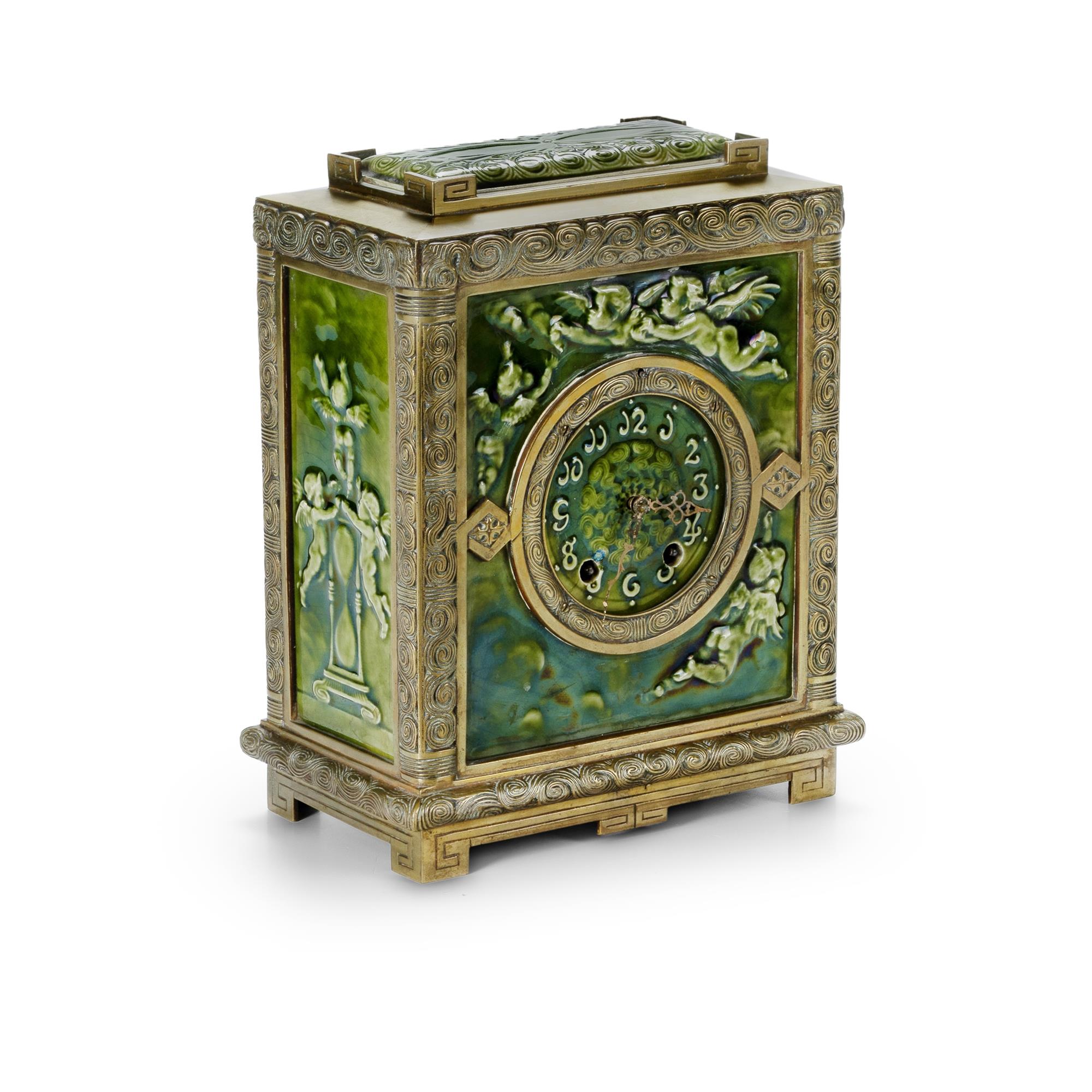 J.G. Low Art Tile and New Haven Clock Co. Brass Mounted 'Albatross' Pattern Mantle Clock circa 1880s. Lacks pendulum or key. (H31cm)Estimate $1,000-2,000