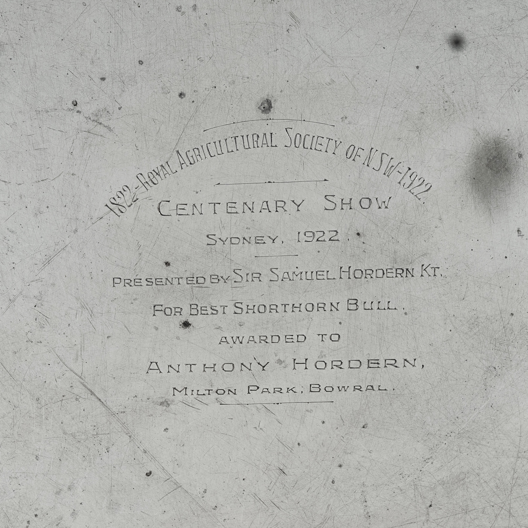 Sterling Silver Salver. Awarded to Anthony Hordern for best Shorthorn bull, Centenary Show Sydney 1922. Hardy Bros. Sheffield. (W1170g Dia.35cm)Estimate $500-1,000