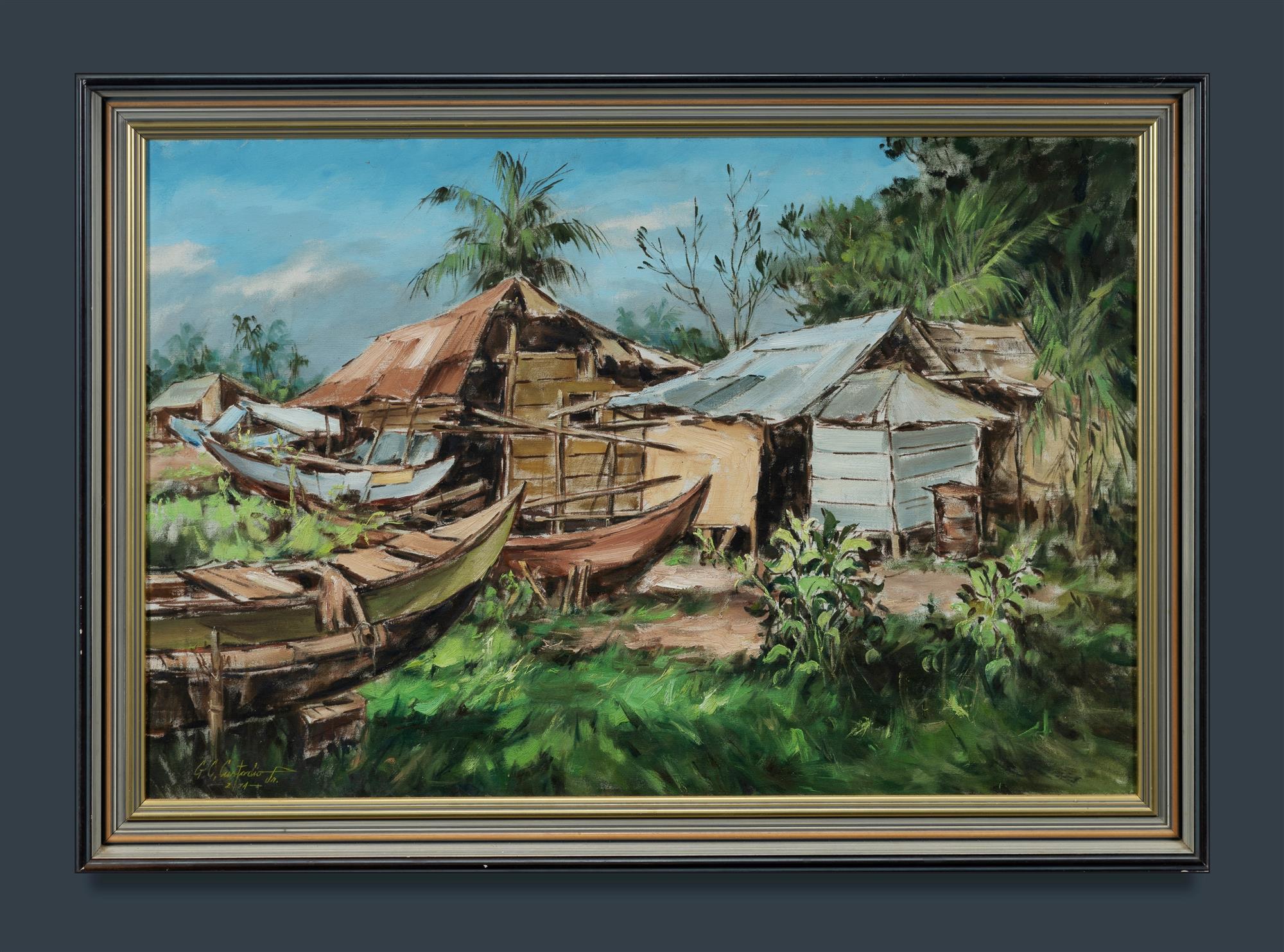 CUSTODIO, Gabriel (Philippines 1912-1993) Village Huts and Boats, 1974. Signed and dated lower left. Oil on Canvas on Board 60x90cmEstimate $600-900