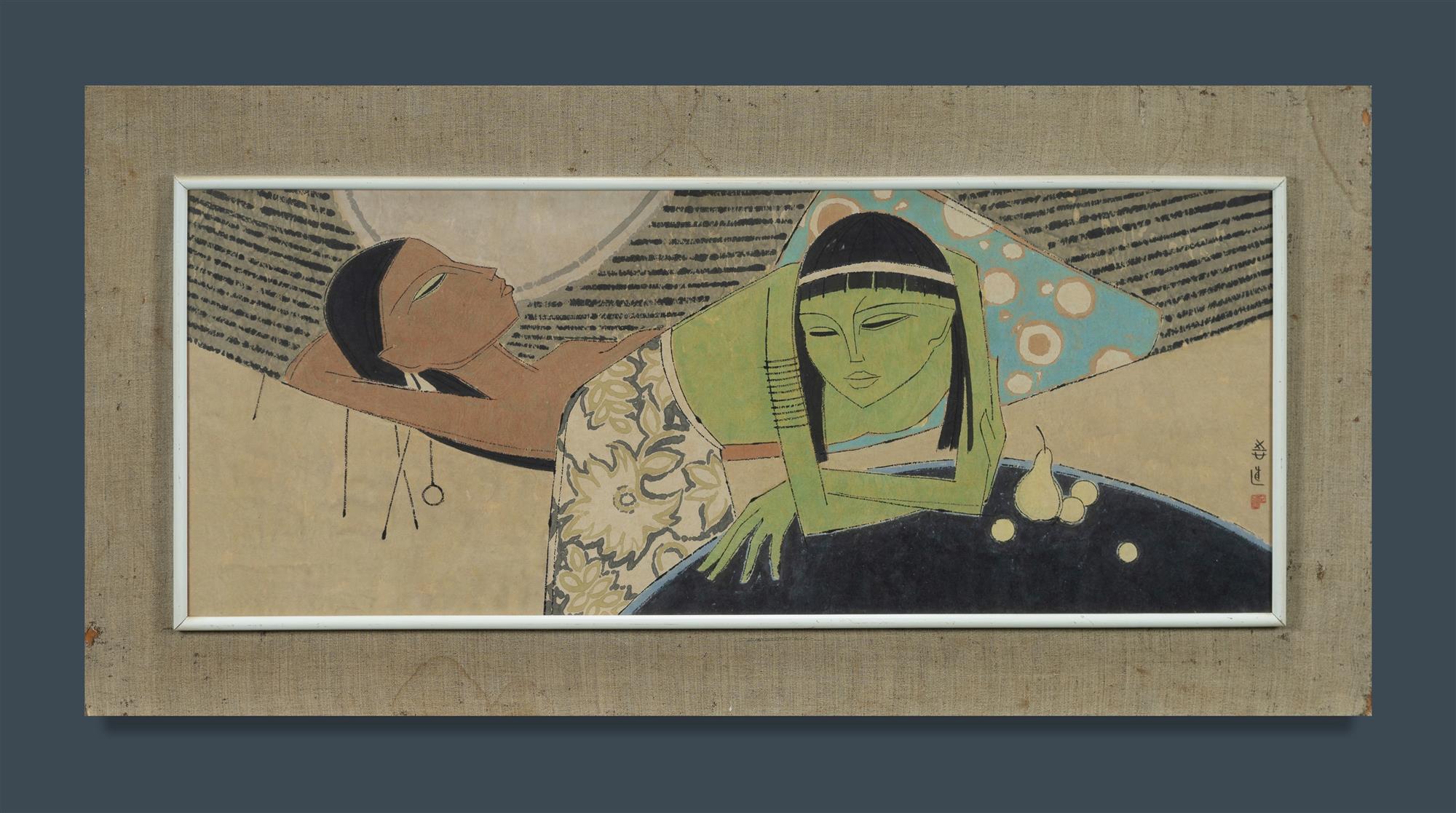 TAY, Chee Toh (Malaysia/Singapore b.1941) Two Women Inscribed centre right. Ink & Colour on Paper 37x94cmEstimate $800-1,500