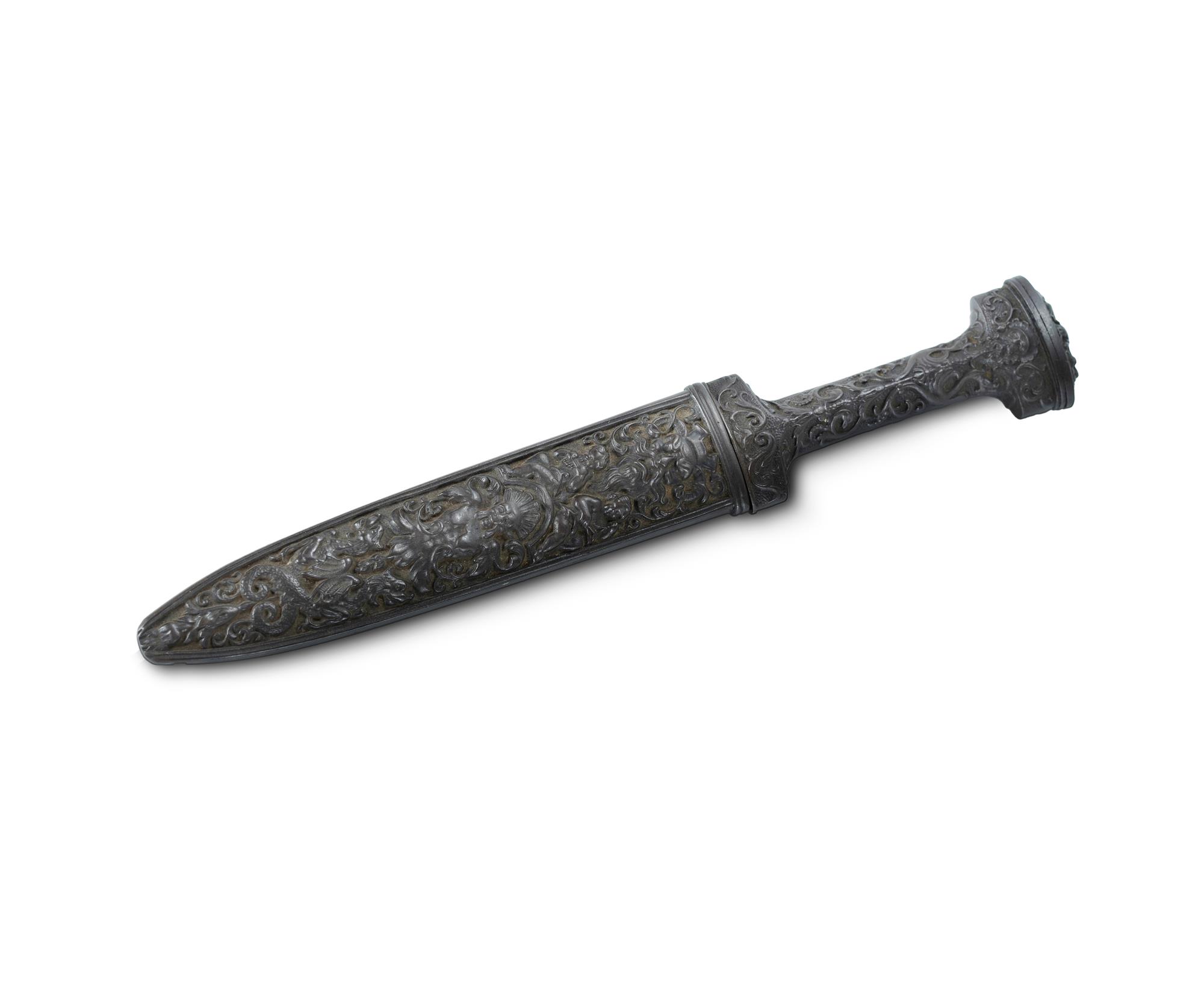 19th C 'Holbein' Dagger. With patinated cast iron hilt and scabbard, decorated in low relief. (L28cm)Estimate $250-400