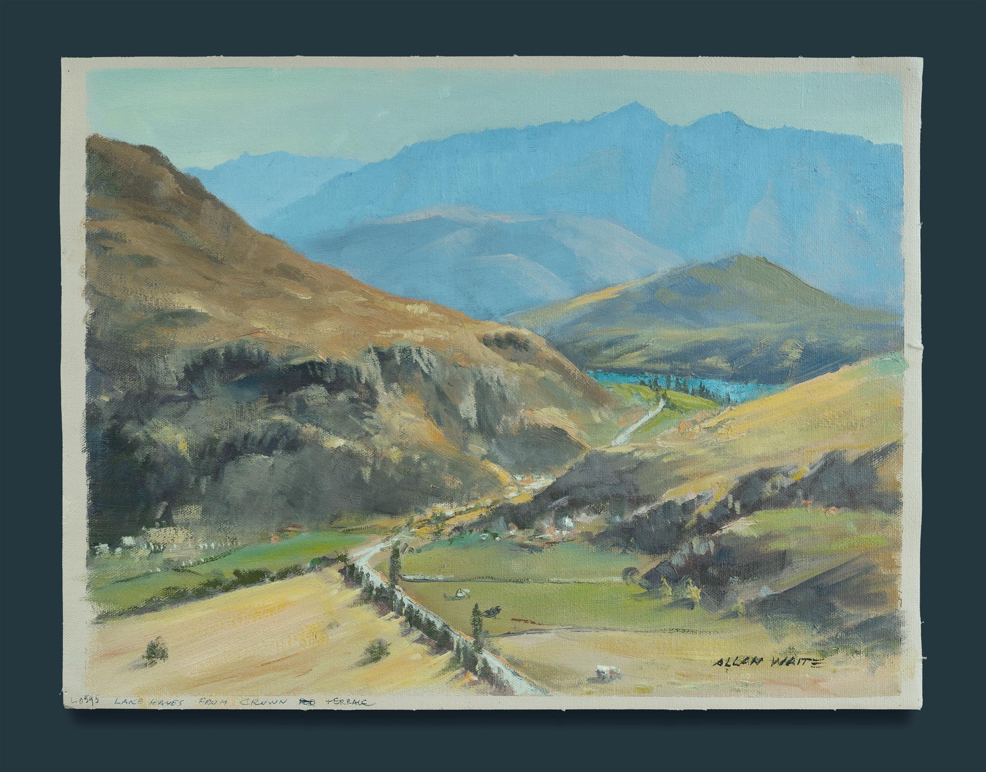 WAITE, Allan (1924-2010) 'Lake Hayes from Crown Terrace [Queenstown, NZ]' Signed lower right; titled lower left. Oil on Canvas 32x42cm PROVENANCE: Family of the Artist.Estimate $80-150