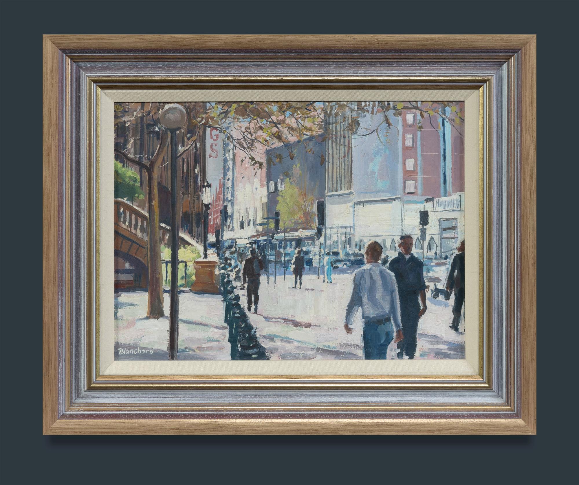 BLANCHARD, Brian (1934-2015) Town Hall Steps, Sydney CBD. Signed lower left. Oil on Board 29.5x40cm PROVENANCE: Family of the Artist.Estimate $200-400