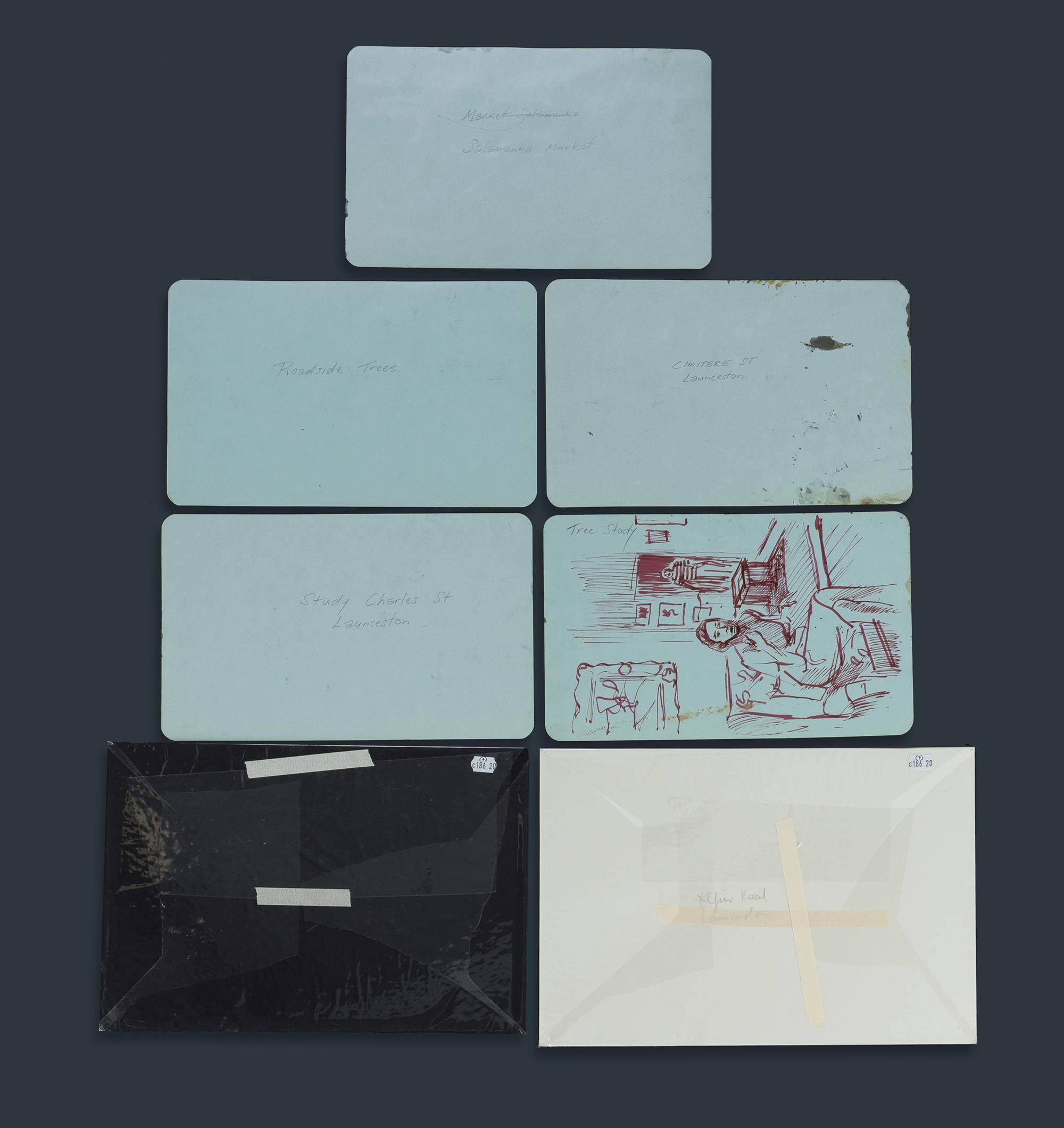 BLANCHARD, Brian (1934-2015), Seven Tasmanian Studies Includes Salamanca Market; Charles St, Launceston; Cimitiere Street, Launceston; Salamanca Place, Hobart; Elphin Street, Launceston; Roadside Trees; and Tree Study. W/Clr (7) 16x26cm each PROVENANCE: Family of the Artist.Estimate $150-300