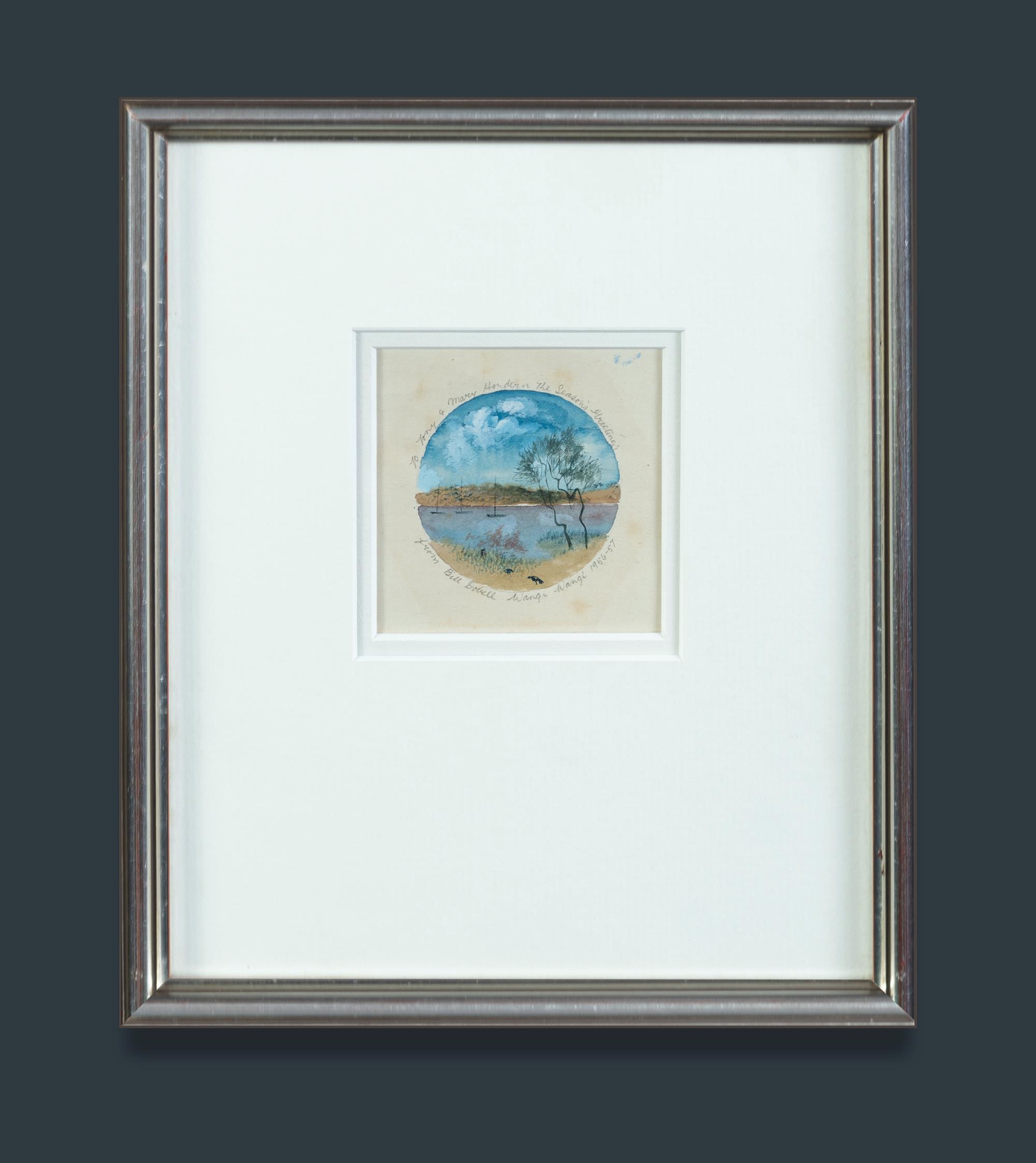 DOBELL, William (1899-1970) Christmas Card - Wangi Wangi, 1956-57. Signed and inscribed in pencil. Gouache 7x7cm (sight), Dia.5cm (image) PROVENANCE: Family of the artist. EXHIBITIONS: 'Dobell in Lake Macquarie,' 19th August - 17th September 1995, Lake Macquarie City Art Gallery, cat #24.Estimate $600-900