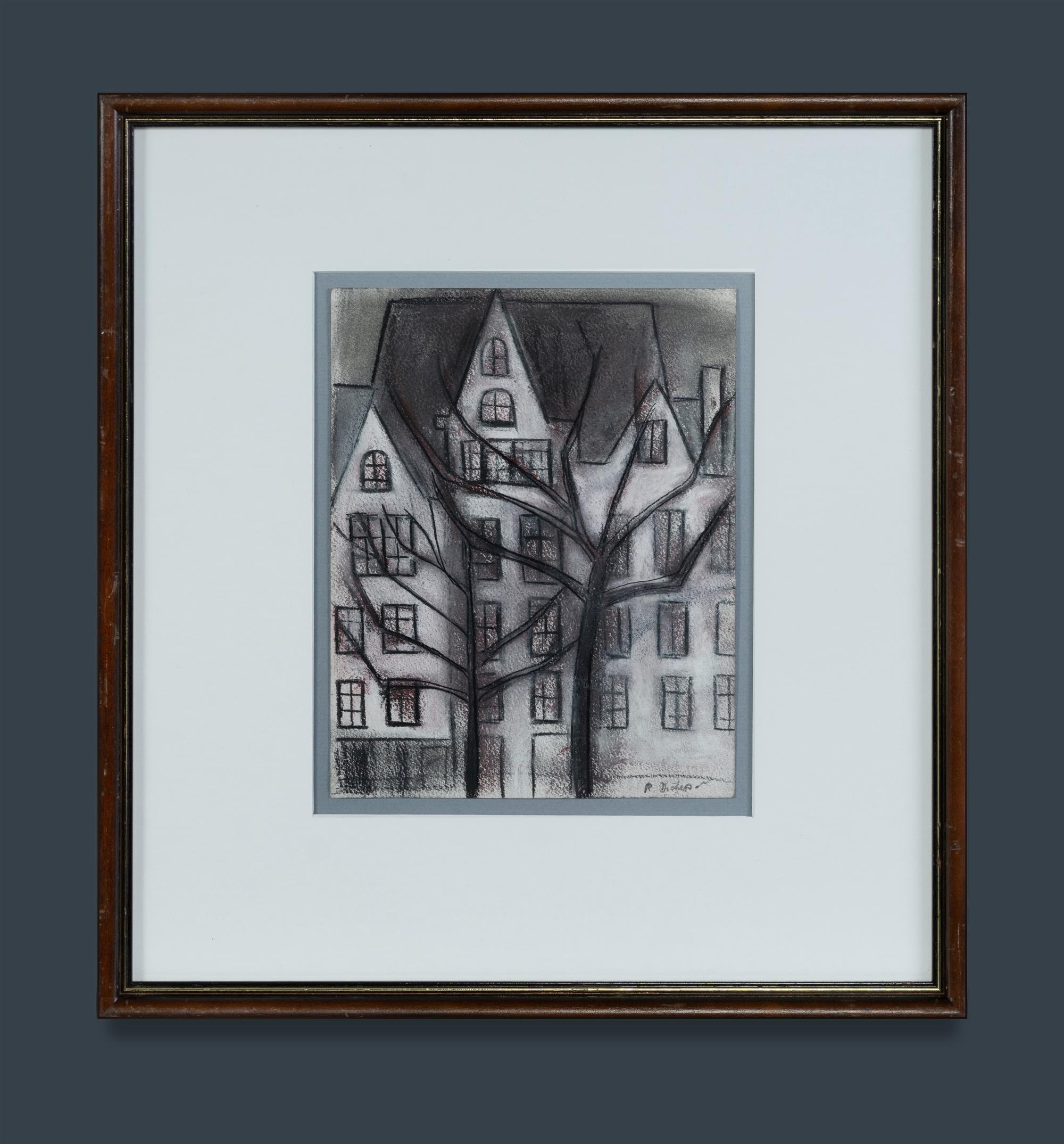 DICKERSON, Robert (1924-2015) London Street / Building with Trees Signed lower right. Inscribed verso 'London Street' concealed by framing. Pastel & Charcoal 24x19cm PROVENANCE: Family of the artist.Estimate $1,100-1,600