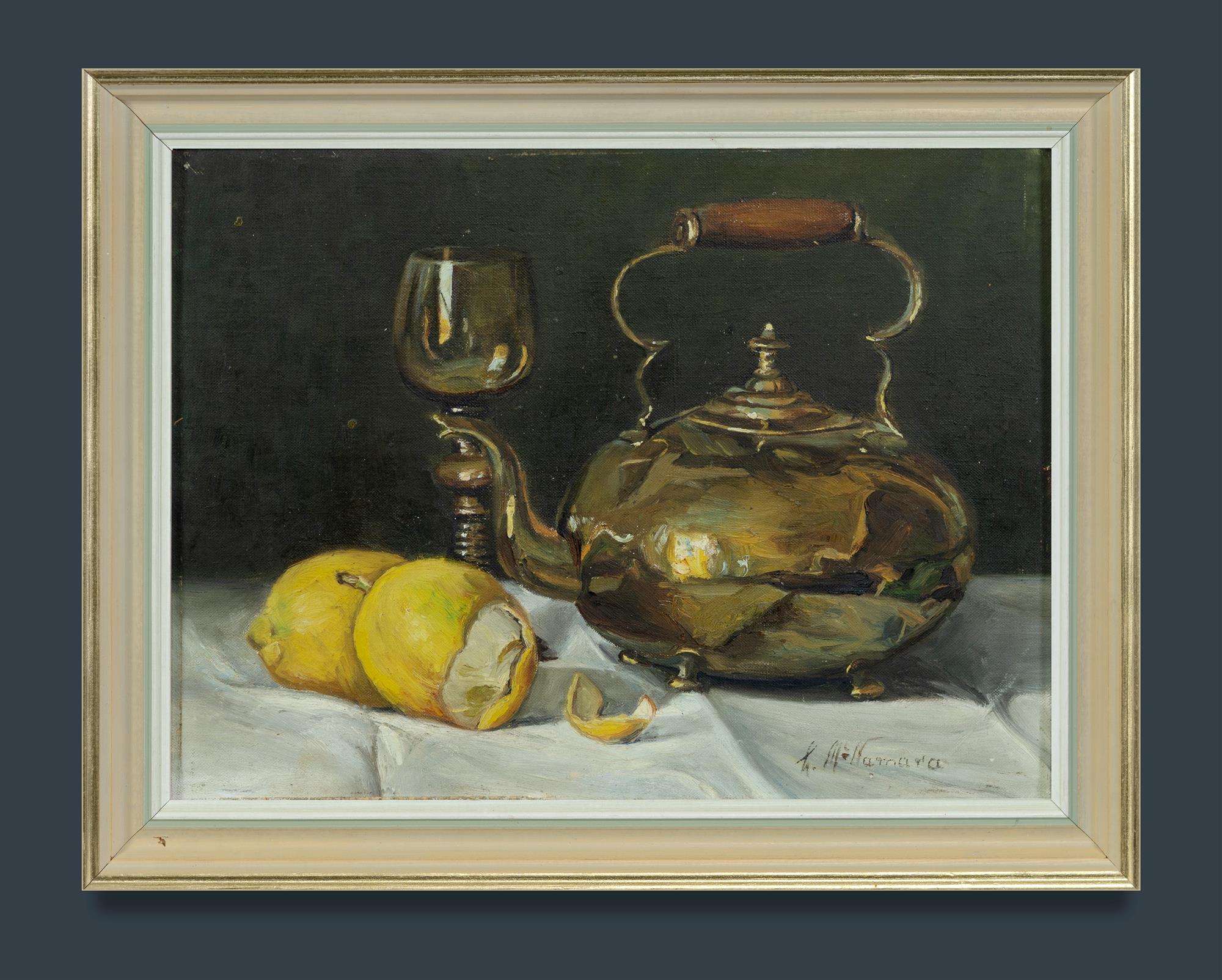 McNAMARA, Leila Constance (1894-1973) Brass Teapot, Hock Glass and Lemons. Signed lower right. Oil on Canvas Board 29x39cm PROVENANCE: Estate of Mary Beatrice Hoyle, niece of the artist.Estimate $200-400