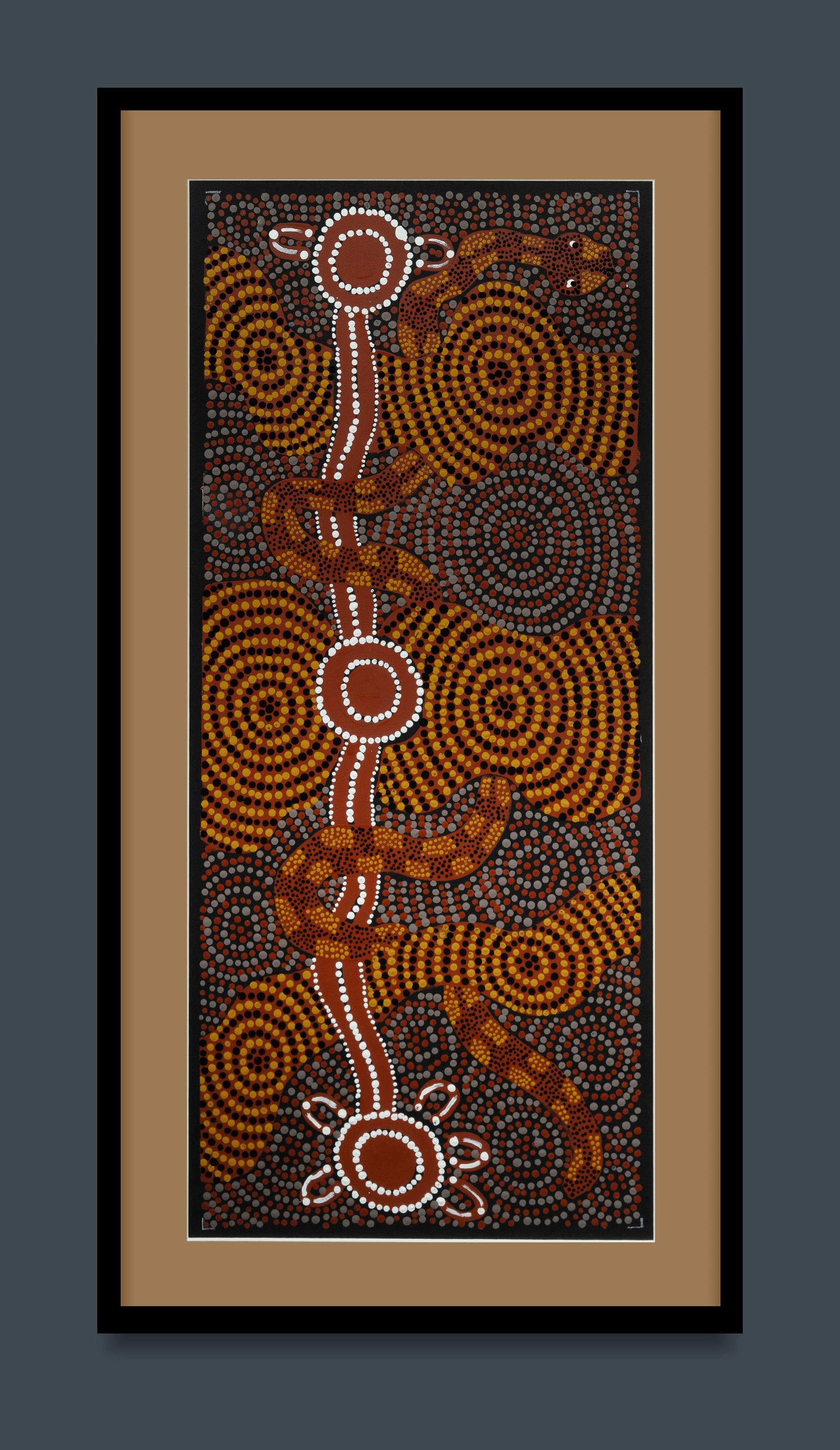 COULTHARD, Millie (Aboriginal School) 'Uluru Tjukurpa,' 2014. Acrylic on Canvas 90x38cm PROVENANCE: Maruku Arts, NT, cat #PN13348 (framed certificate included); Estate Late Larry Shaw, Cowra NSW.Estimate $300-500