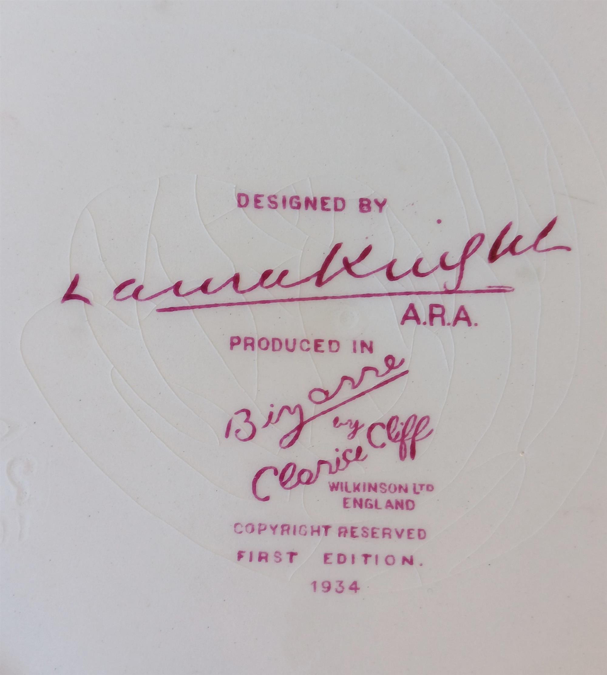 Clarice Cliff Circus Pattern Bizarre Plate, c.1934. Designed by Dame Laura Knight. Hand-painted with clowns. (Dia.23cm) PROVENANCE: Collection John D. Chesterman, Sydney.Estimate $400-800
