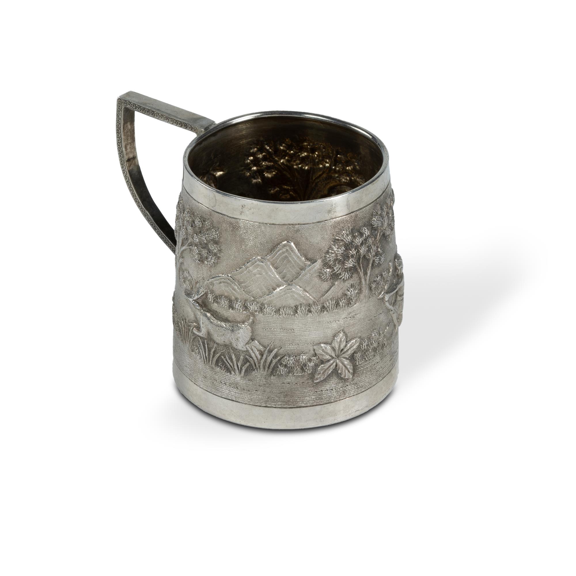 Late 19th C Anglo-Indian Silver Tankard By Monohur Dutt, Calcutta. Repousse decoration of hunting scene. Cartouche with monogram 'M.G.H' (H7cm W139g)Estimate $100-200