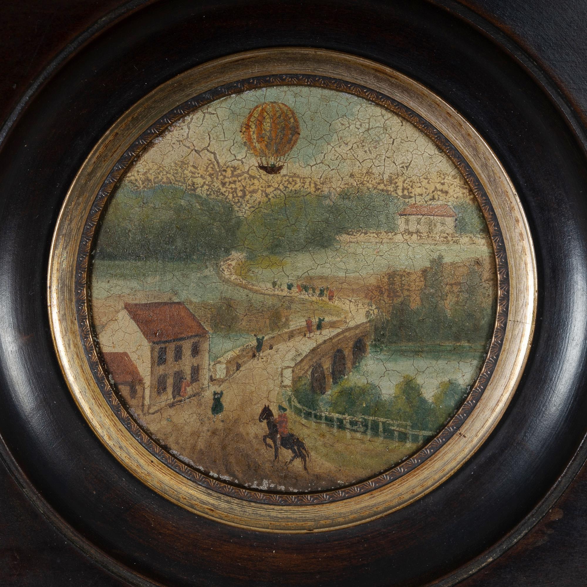 French School, 19th Century (3) Three Miniatures with Views of Old France Including Pont Neuf Bridge, Paris, and two hot air balloon scenes. Unsigned. Oil on Copper (3) Dia.8cm (each)Estimate $300-500