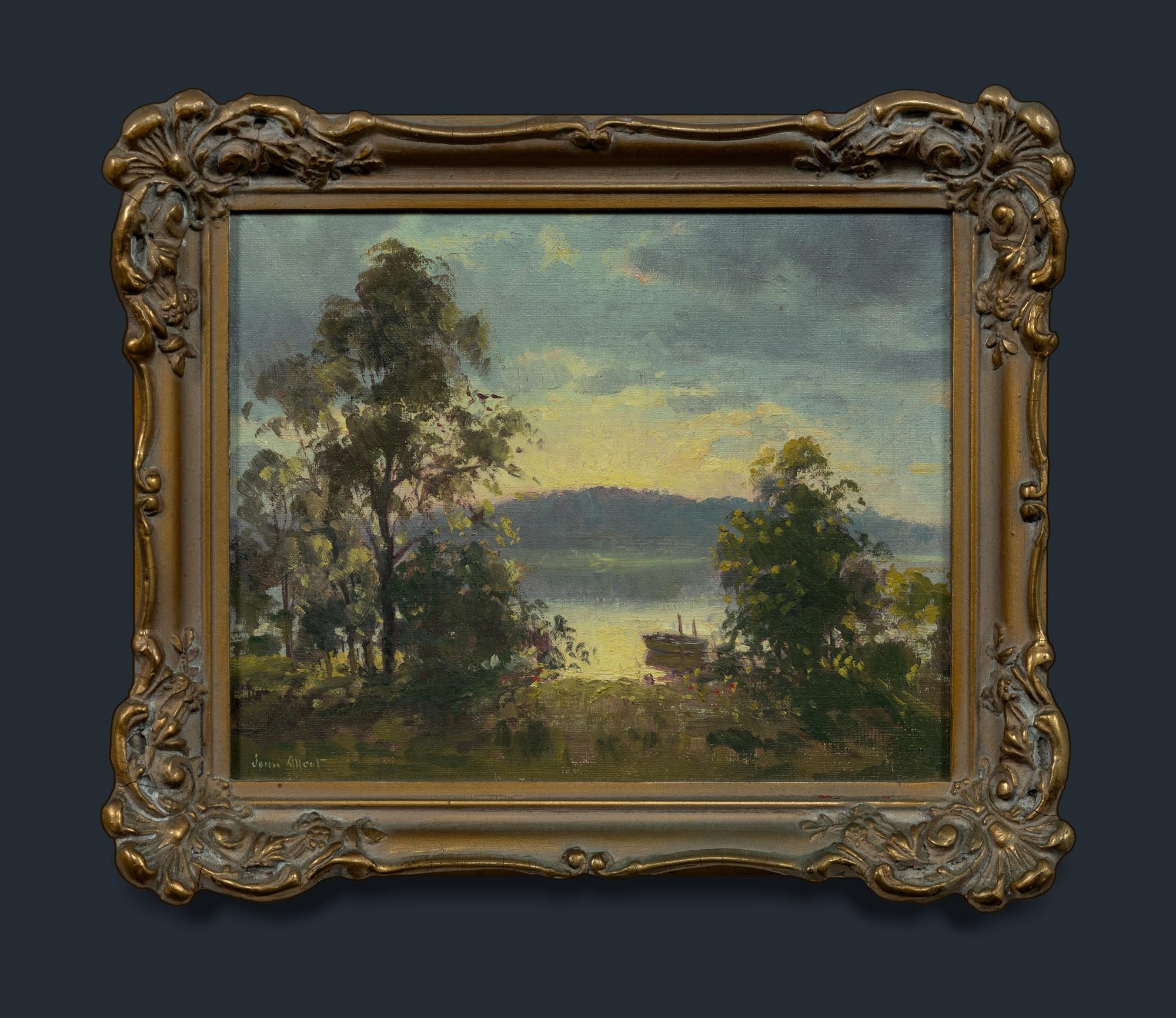 ALLCOT, John (1888-1973) Late Afternoon with Moored Rowing Boat Oil on Canvas on Board 19.5x24.5cmEstimate $400-700