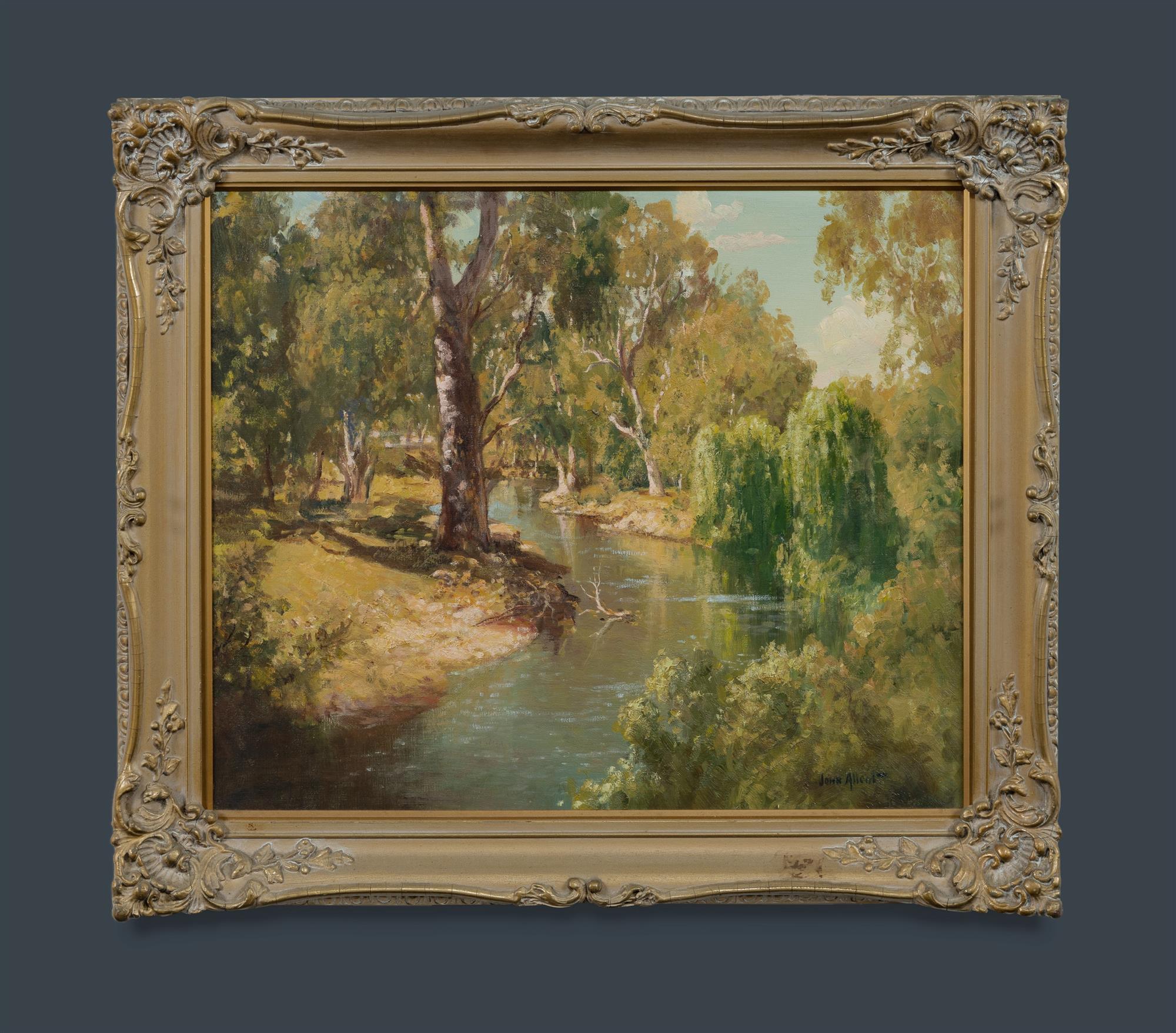 ALLCOT, John (1888-1973) Meandering River with Dappled Light Oil on Canvas Board 48.5x58.5cmEstimate $1,200-2,500