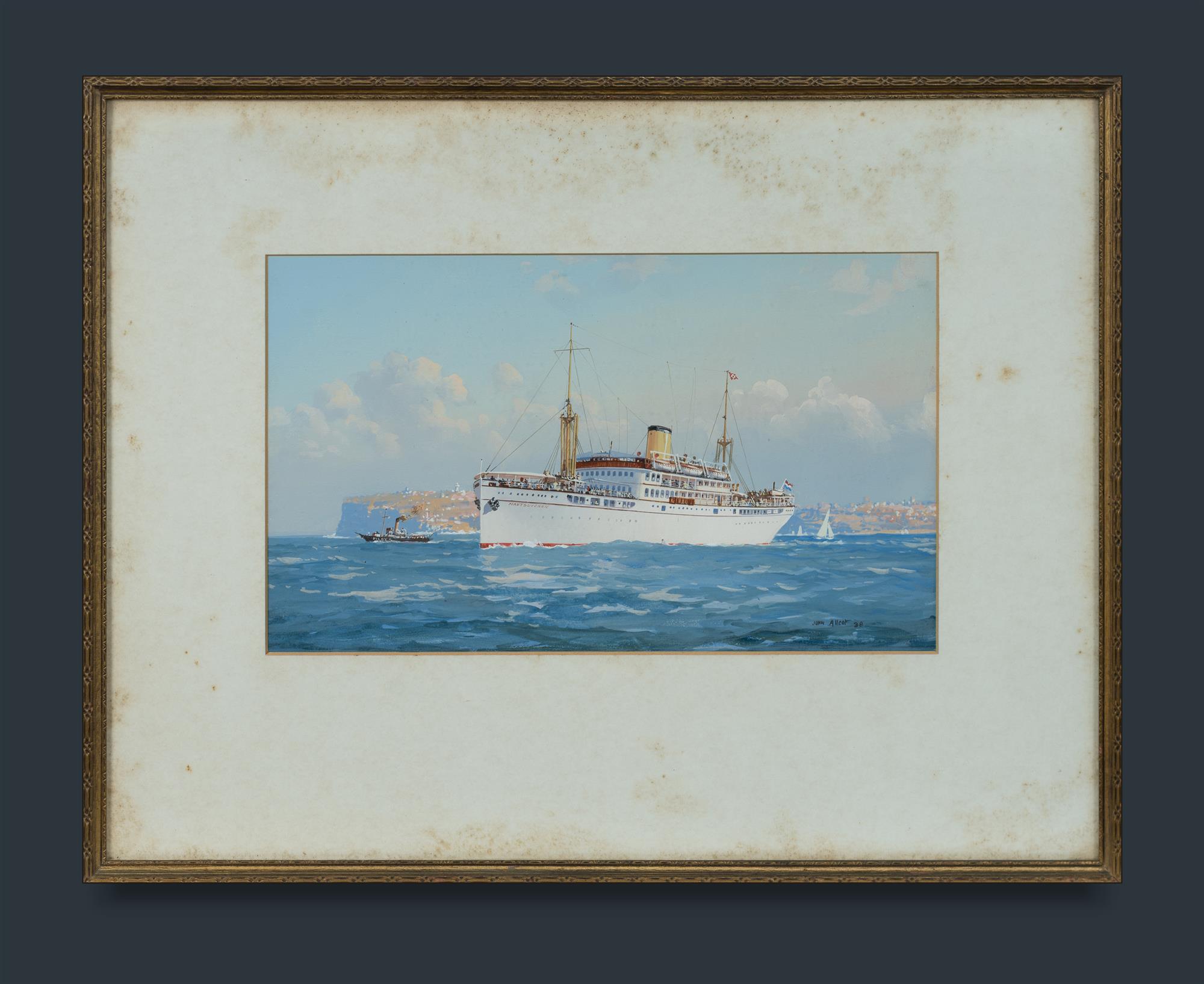 ALLCOT, John (1888-1973) 'MS Maetsuycker in Sydney Harbour,' 1938. Gouache 22x37cm OTHER NOTES: MS Maetsuycker was a Dutch cargo ship built in 1936 which was later converted to a hospital ship, cargo ship and troopship.Estimate $700-1,200