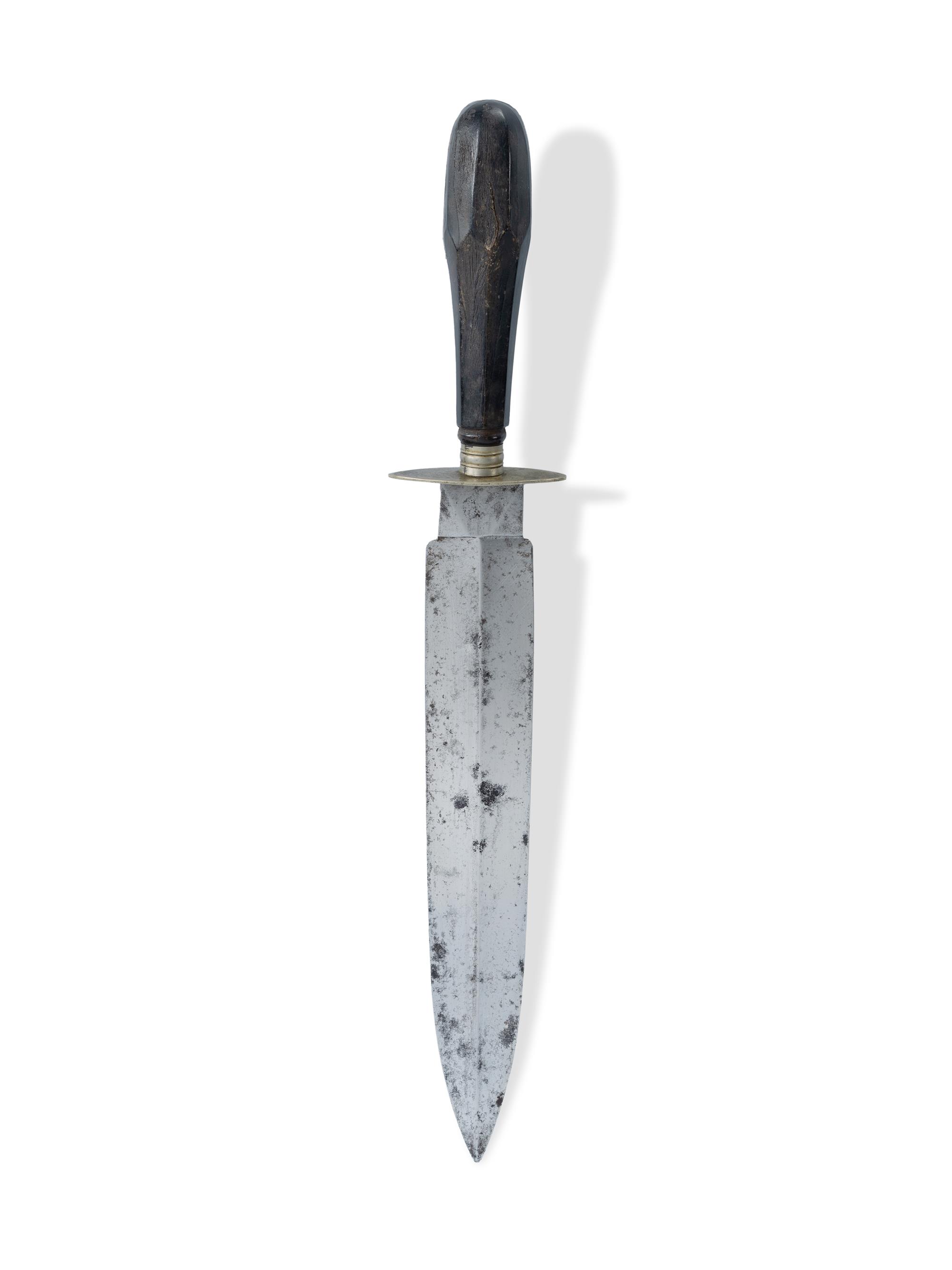 Mid 19th C Sheffield Bowie Knife Needham Brothers. Large spearpoint blade, ricasso stamped 'Needham Brothers, Celebrated Cutlery'. German silver oval guard and bolster. Pressed horn octagonal hilt. (L38cm) Ex Archer Collection, Tasmania; ex Ian Cummins Collection. PROVENANCE: From the collection of the late Warren Mallard LITERATURE: 'A Sure Defence, the Bowie Knife Book' 1988, No.49 pp.38-39. Kenneth Burton.Estimate $500-800