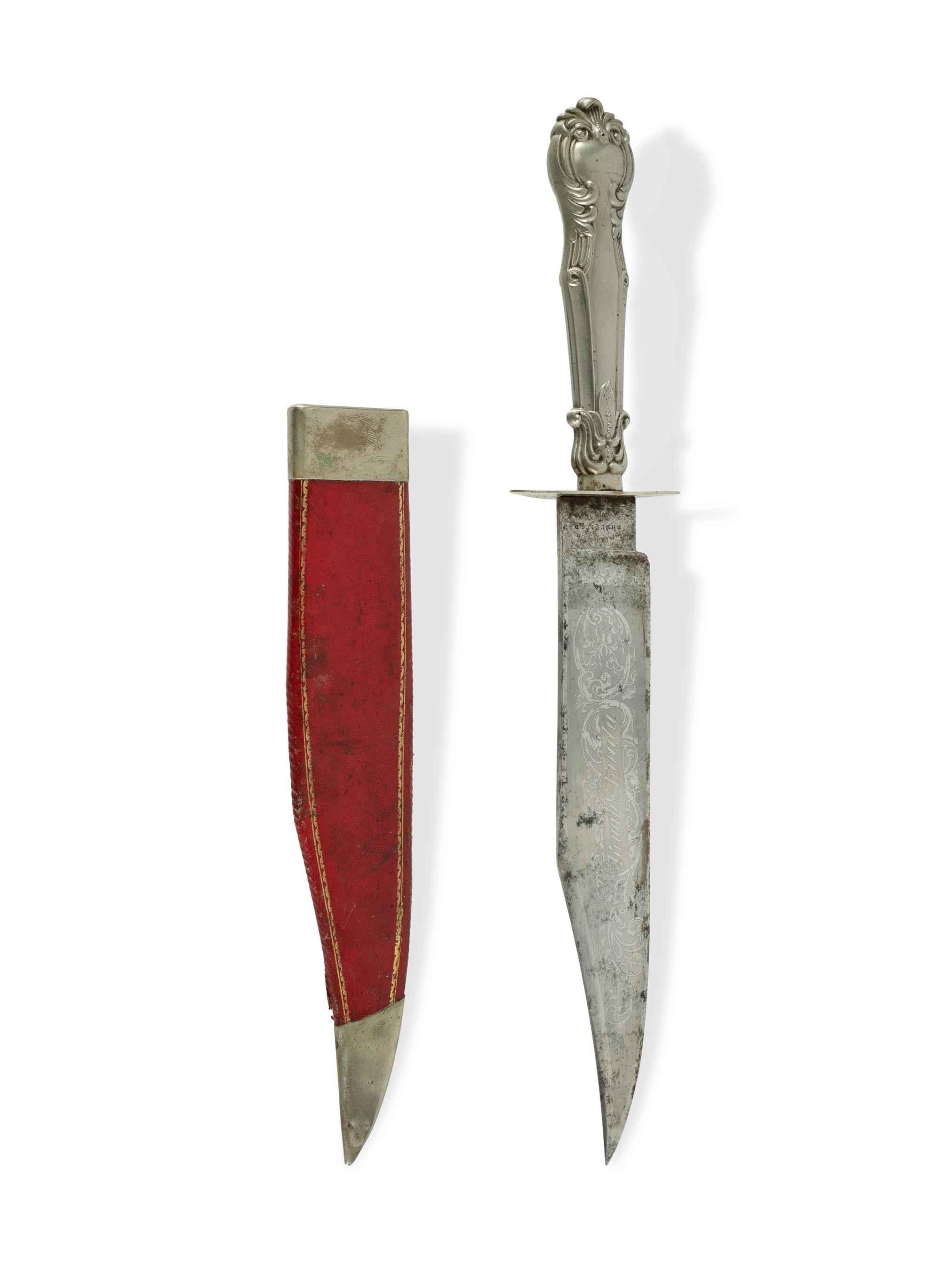 19th C Clip Point Bowie Smith & Co. Sheffield. The blade etched 'Rough & Ready'. Nickel silver oval guard and cutlery hilt. Original gilt and Moroccan leather scabbard. (L37cm) PROVENANCE: From the collection of the late Warren MallardEstimate $300-600