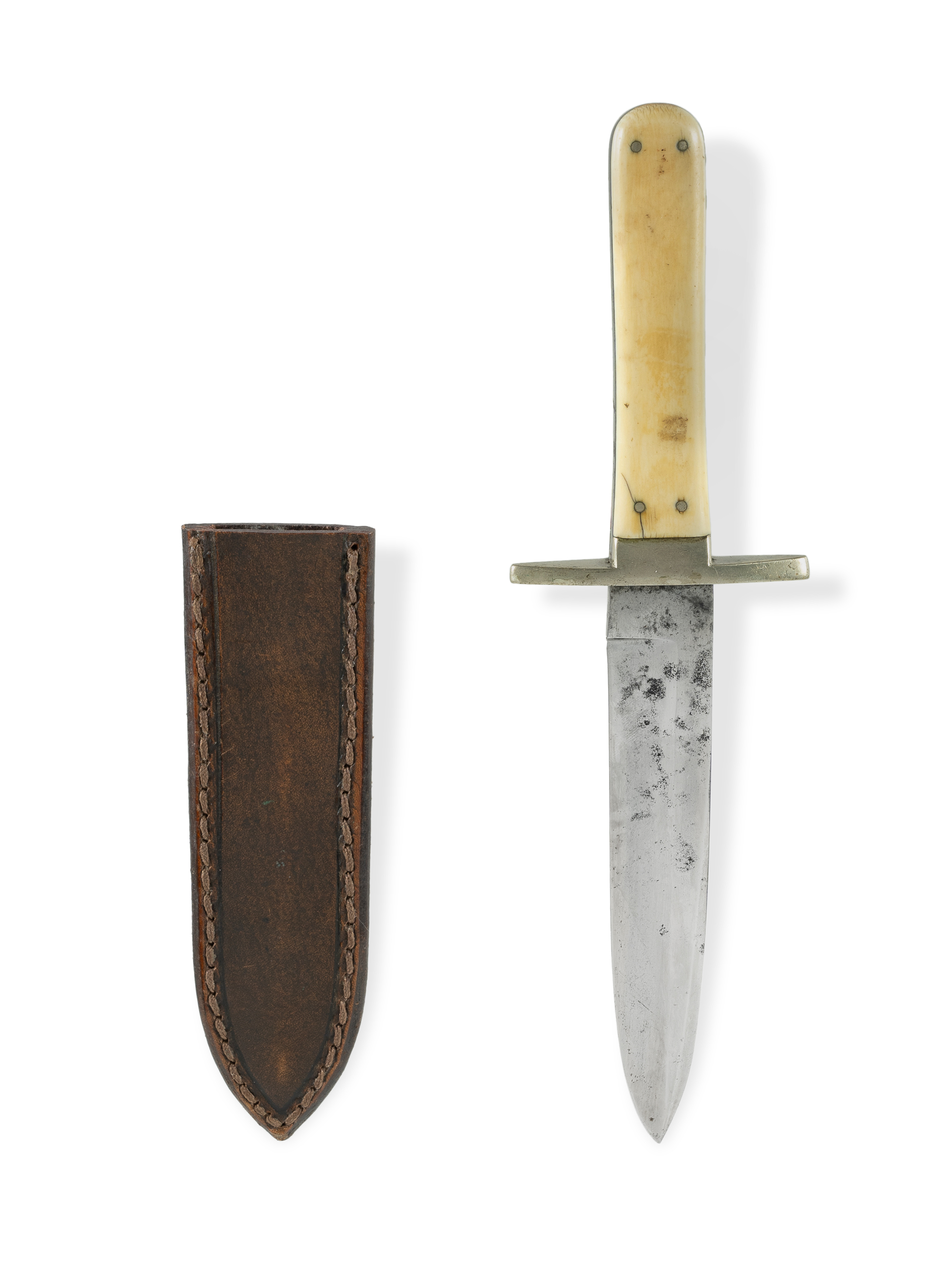 Small George Wostenholm Bowie Spear point blade with false edge. The blade marked 'G. Wostenholm & Son, Washington Works, Sheffield', 'The Real IXL Knife', and 'The Hunters Companion'. Marked 'I*XL' to ricasso. Ivory slab grips. Nickel silver guard and inset escutcheon to hilt. Later leather scabbard. (L22cm)