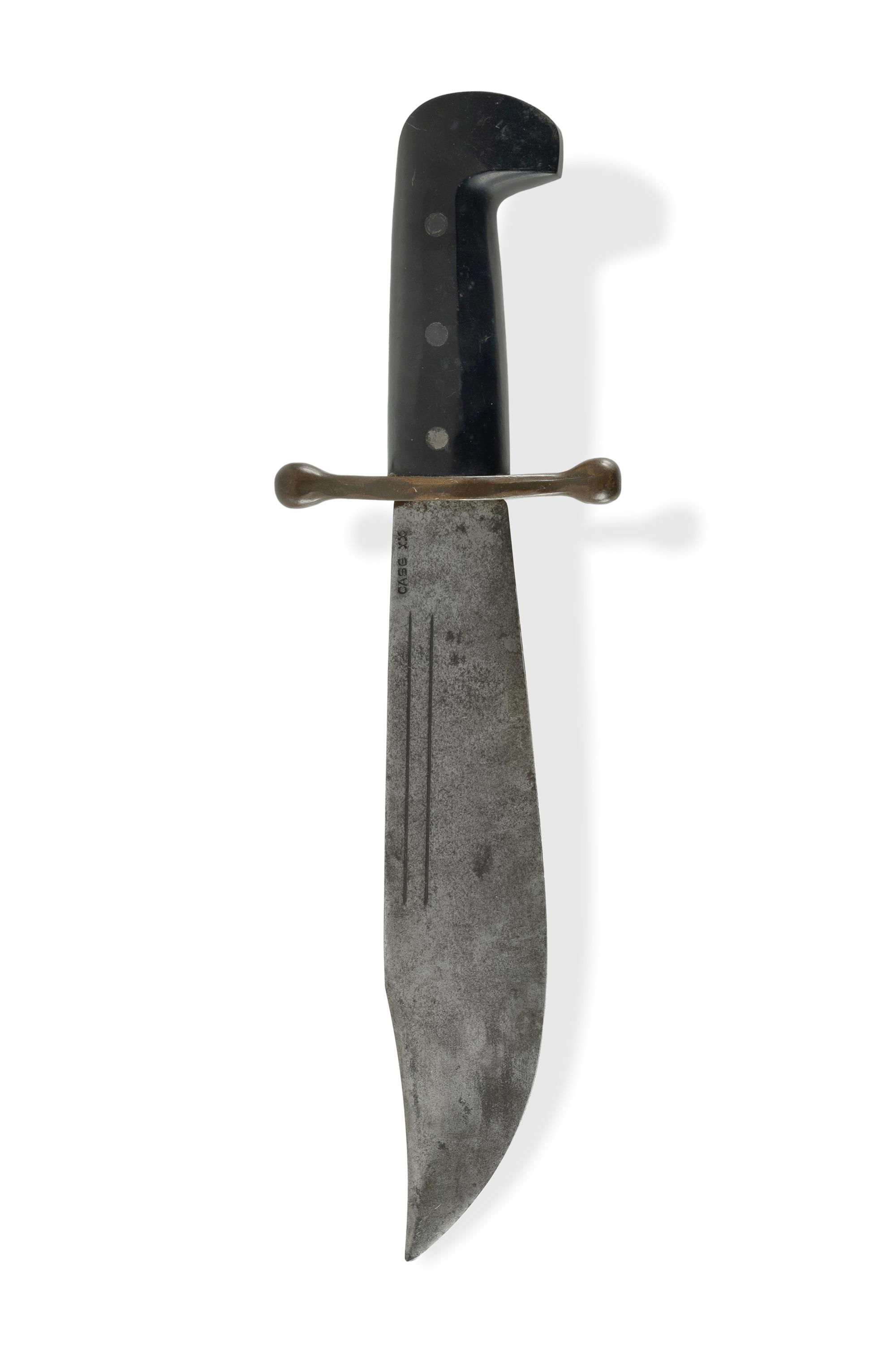 WWII US Case XX Survival Knife Clip point bowie with twin narrow fullers. Stamped 'Case XX'. Brass cross guard and bakelite hilt. (L36cm) PROVENANCE: From the collection of the late Warren MallardEstimate $300-500