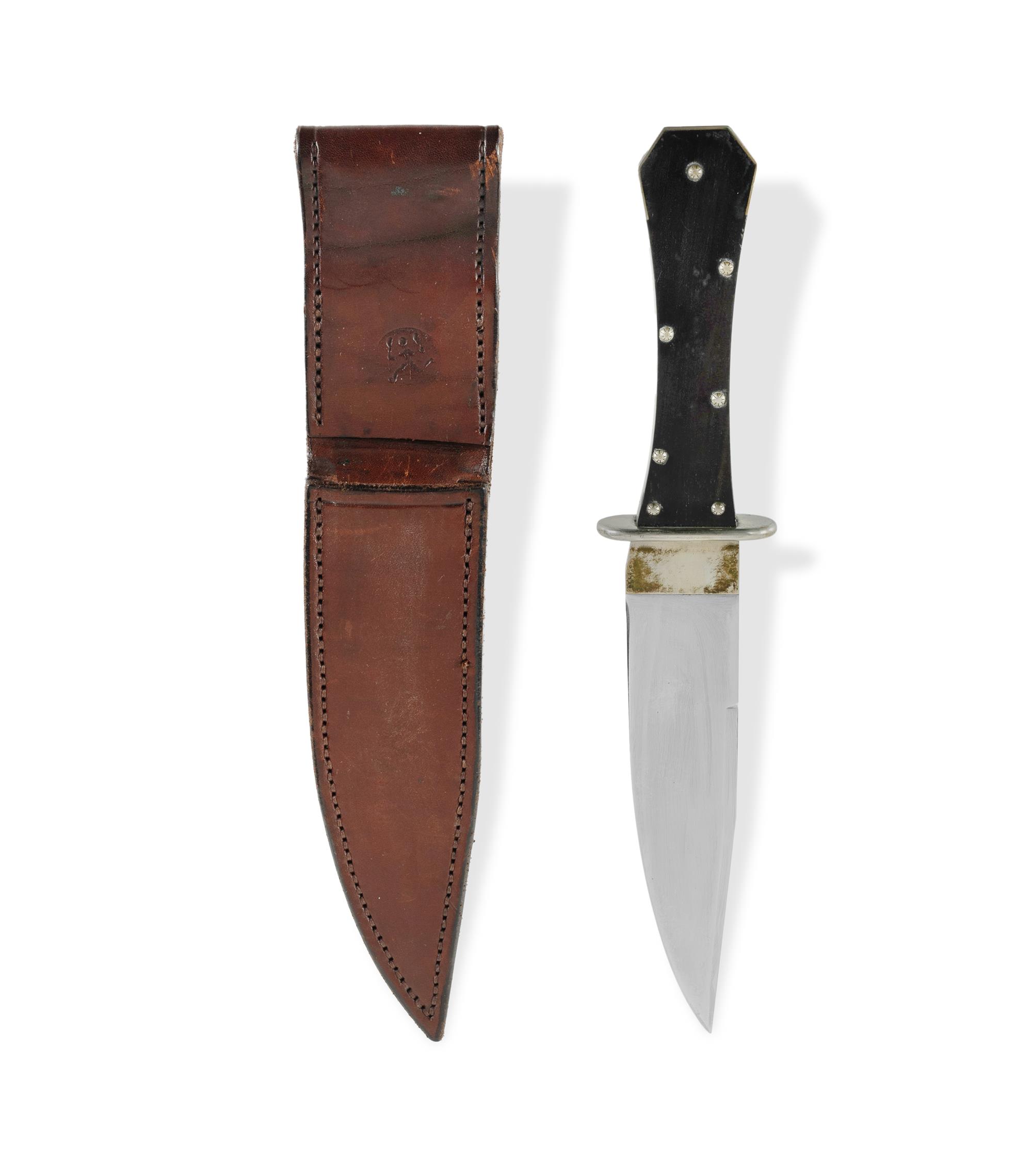 Handmade Custom 'Bushmans Edge' Replica Bowie Knife Jim Steele. Clip point with false edge. Ebony slab grips with nickel mounts on a coffin shaped hilt. With leather scabbard. (L29cm) PROVENANCE: From the collection of the late Warren MallardEstimate $100-300