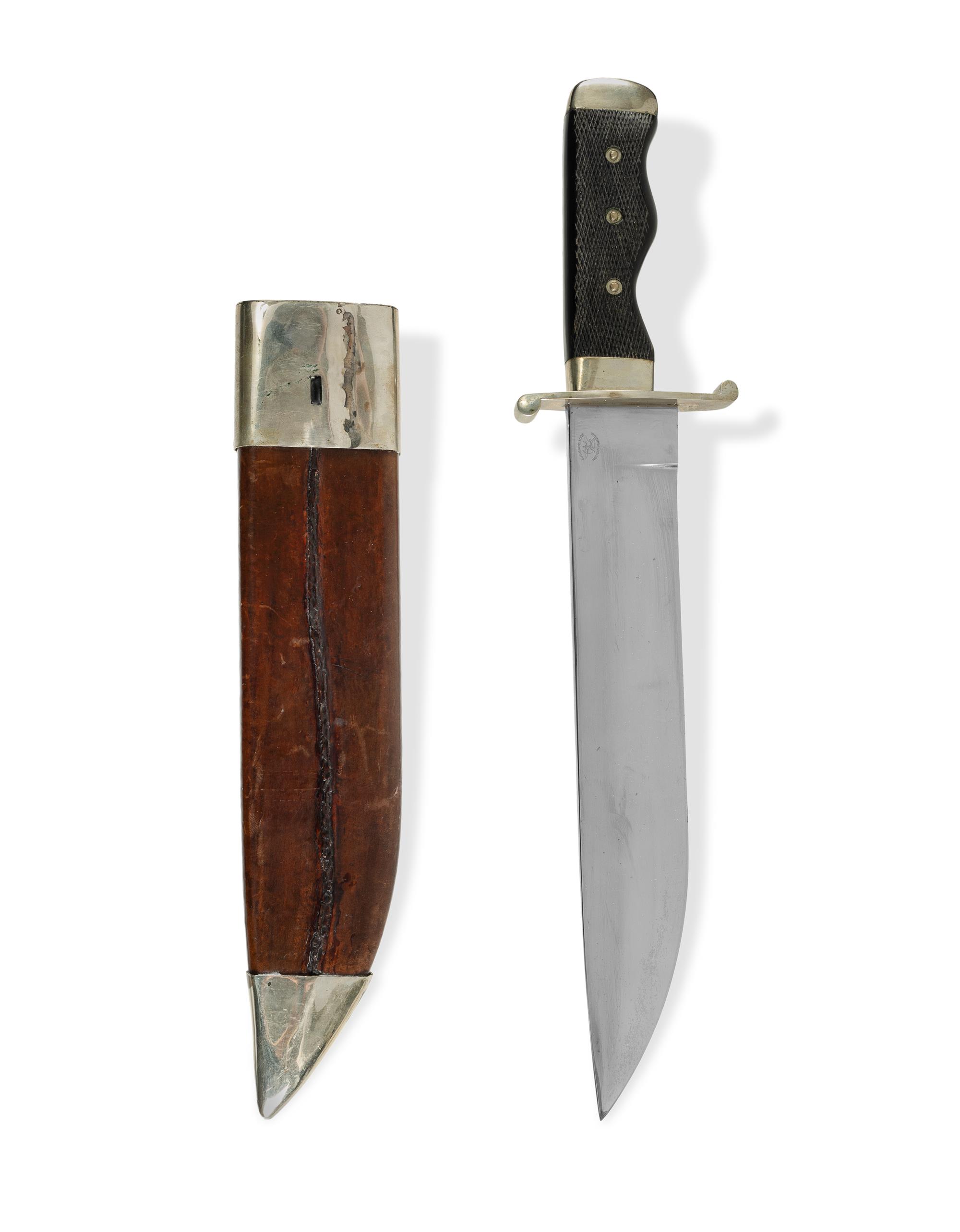 Handmade Custom 'Bushmans Edge' Replica Bowie Knife Jim Steele. Wide blade, nickel silver guard, hilt and sheath mounts. Chequered ebony grips with recessed finger rests. (L41cm) PROVENANCE: From the collection of the late Warren MallardEstimate $150-300