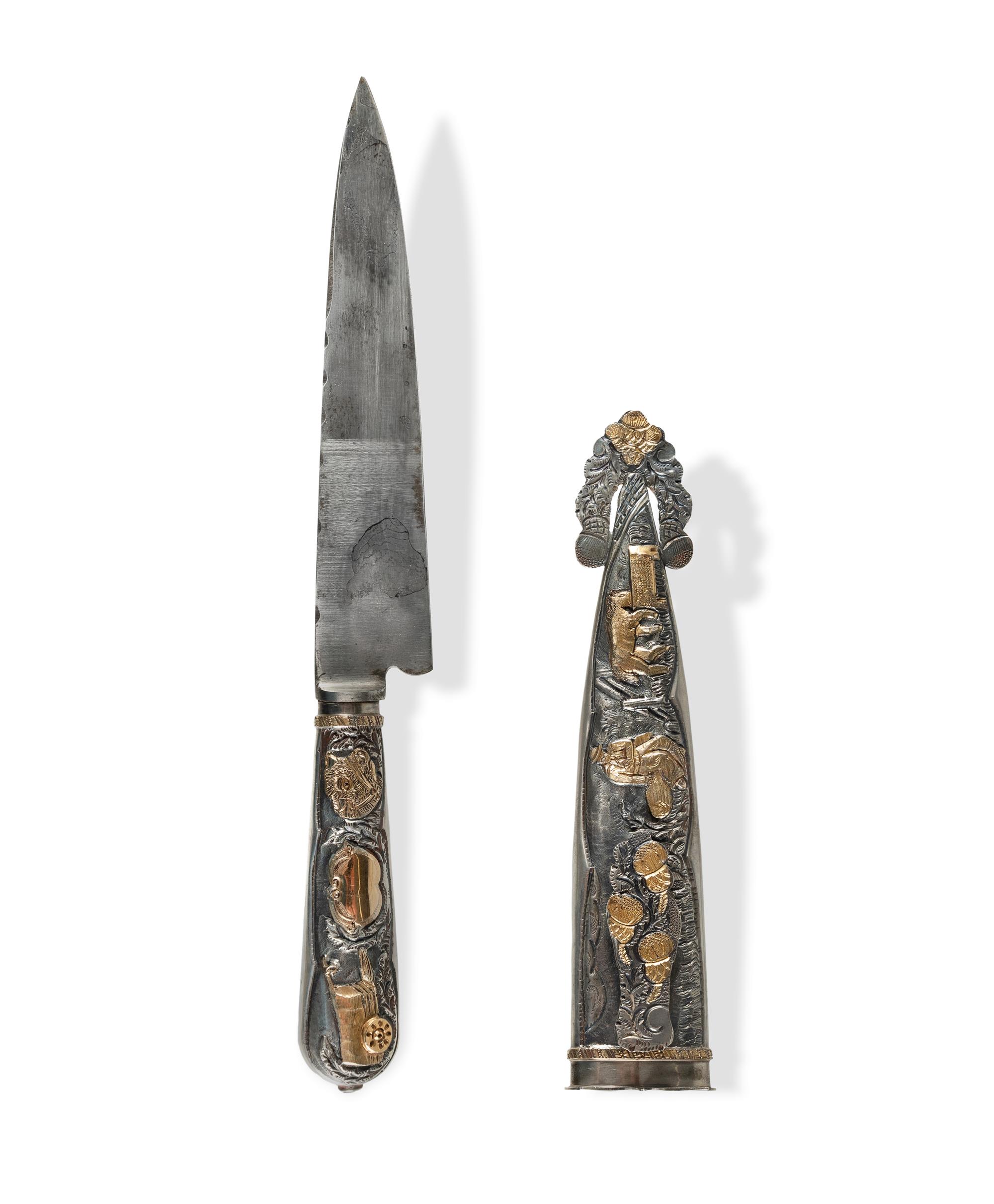 Early 20th C 800 Silver and Gilt Gaucho Knife Silver hilt and scabbard decorated with farmers working and dancing. (L26cm) PROVENANCE: From the collection of the late Warren MallardEstimate $250-450