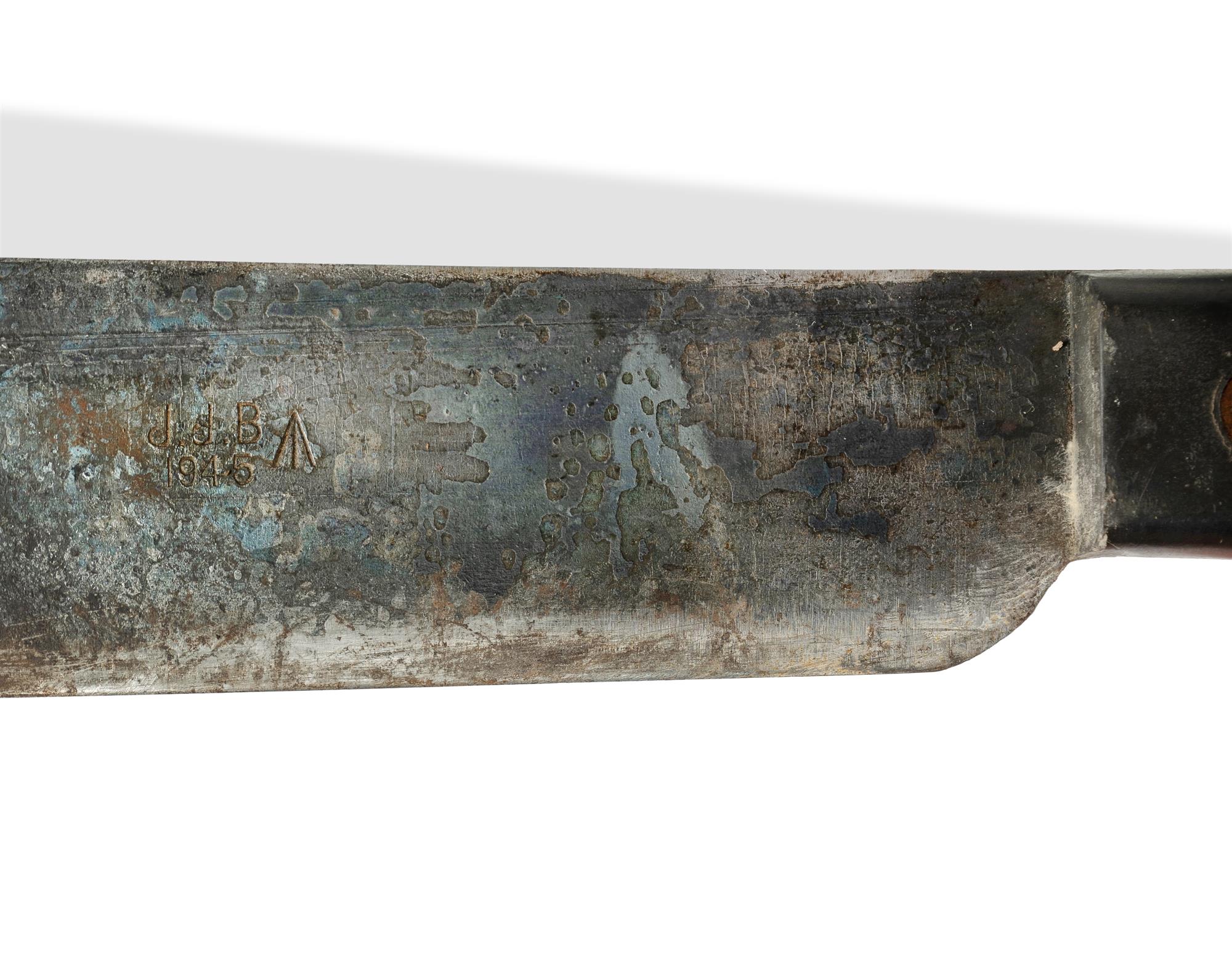 WWII British J.J.B. Machete and Scabbard The blade stamped 'J.J.B. 1945' and broad arrow. The leather scabbard stamped 'P.I. 1945'. (L50.5cm) PROVENANCE: From the collection of the late Warren MallardEstimate $50-100