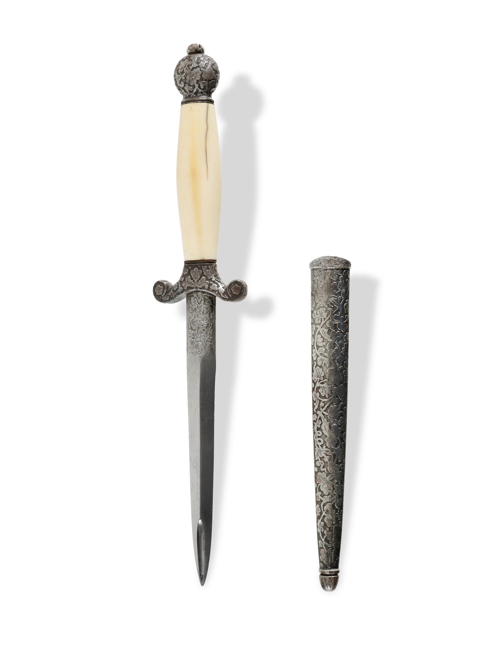 19th C 'Virtue Dagger' Double edged blade of flattened diamond section. Ivory hilt. The iron guard, pommel and scabbard all with matching engraved floral decoration. NB: ivory export restrictions (L20cm)
