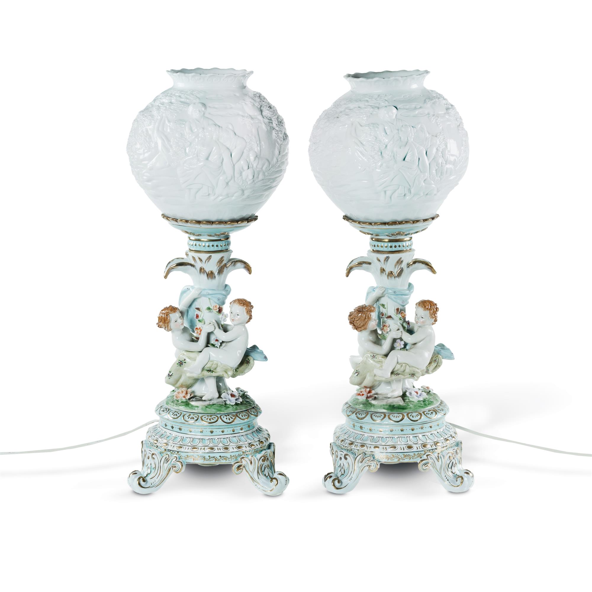 Pr 20th C Porcelain Figural Lamp Bases with Lithophane Shades The base with two frolicking children. Marked 'Dresden' to base. (H60cm)Estimate $300-500