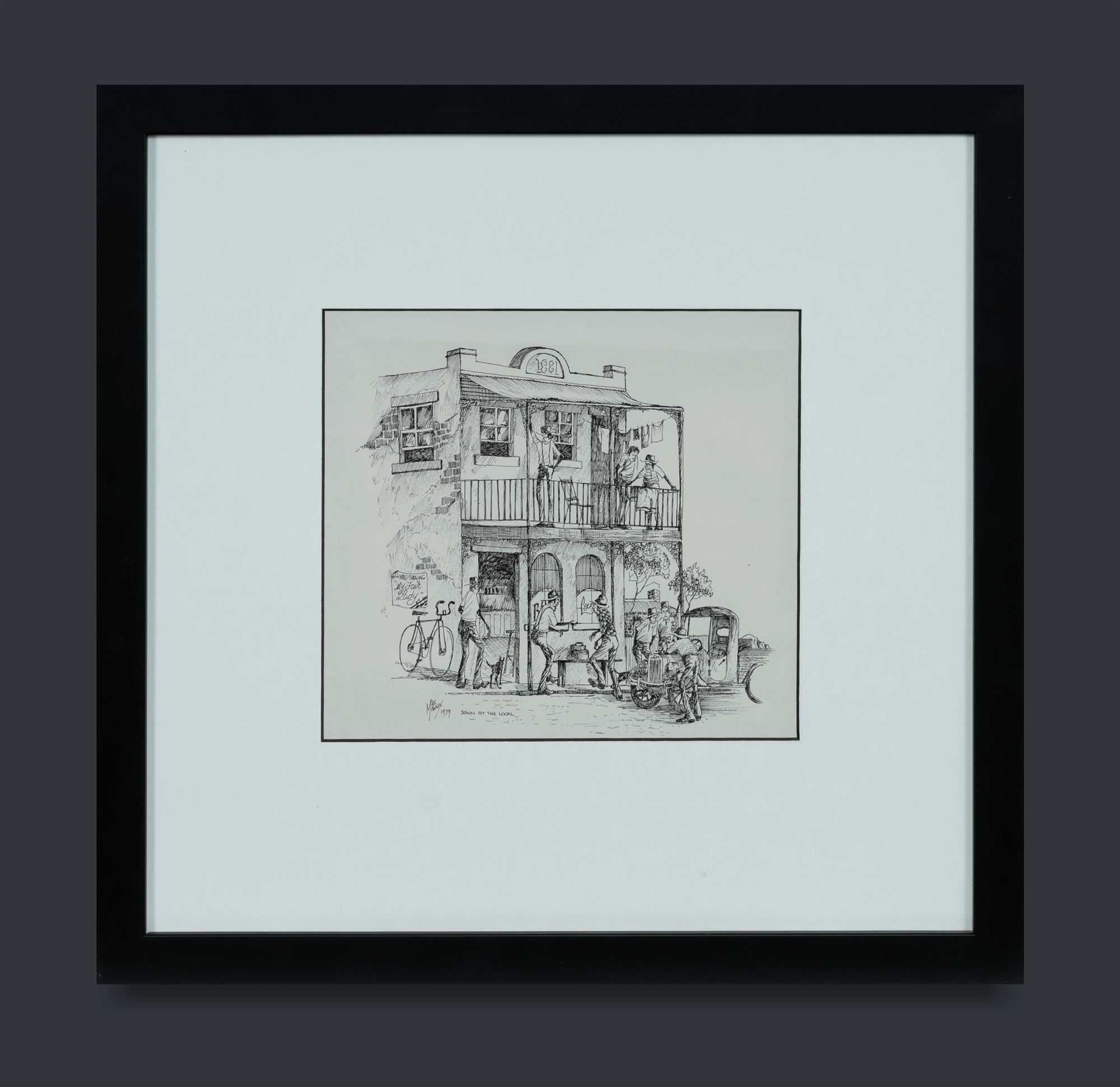 MANNIX, Max (b.1939) 'Down at the Local,' 1979. Additional pen sketch verso, dated 2011. Pen & Ink 23x25.5cmEstimate $200-400