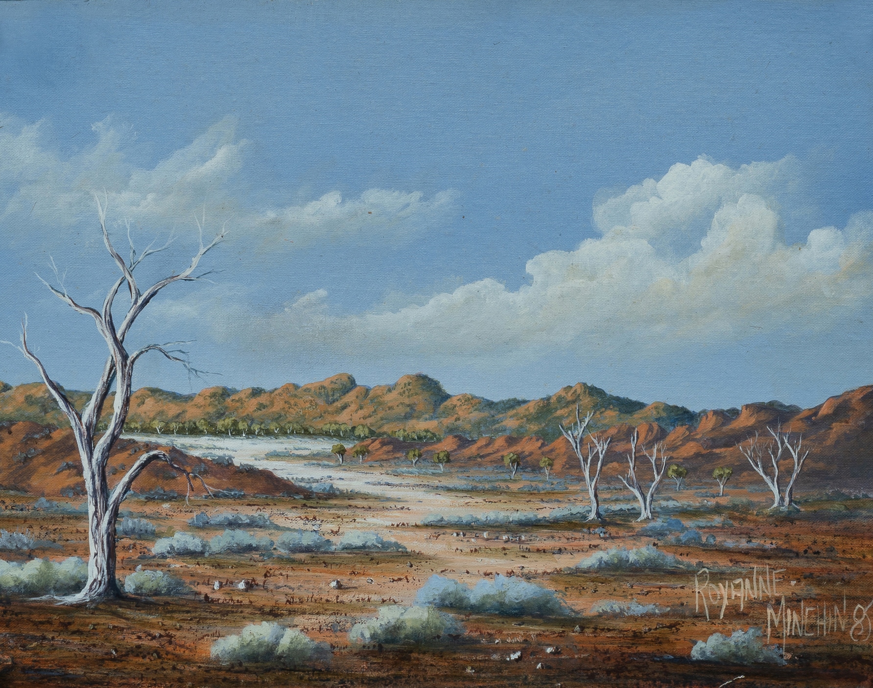 MINCHIN, Roxanne (b.1956) (2) 'Towards the Manna Hills, SA' and 'Near Yanco Glen [NSW]', both 1985. Acrylic on Board (2) 23x30.5cm (each)Estimate $400-600