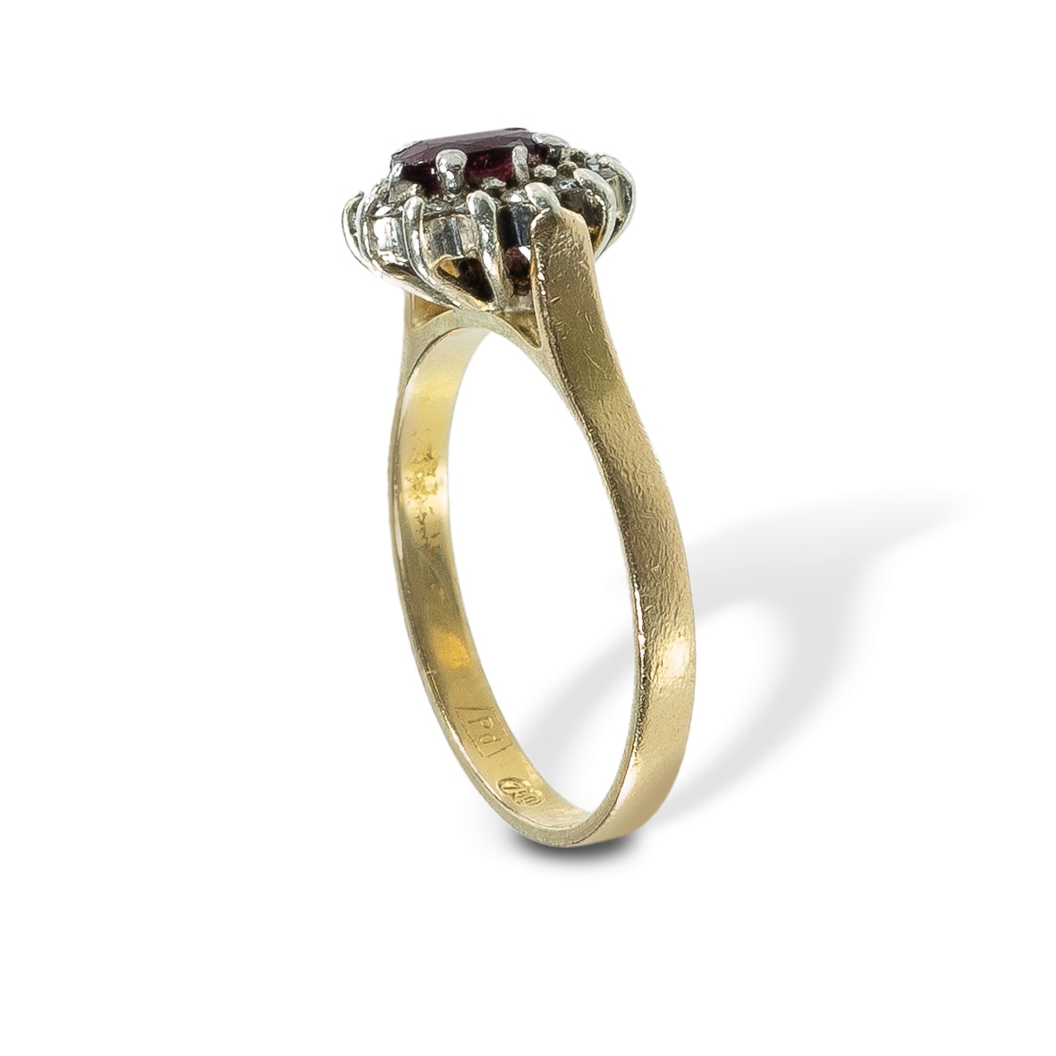 18ct Yellow Gold & Palladium Ruby & Diamond Ring Oval ruby and diamond cluster, circa 1950s/60s. Ruby 0.57ct (approx) Diamond total weight 0.28ct (approx) W3.5g (approx)Estimate $300-500