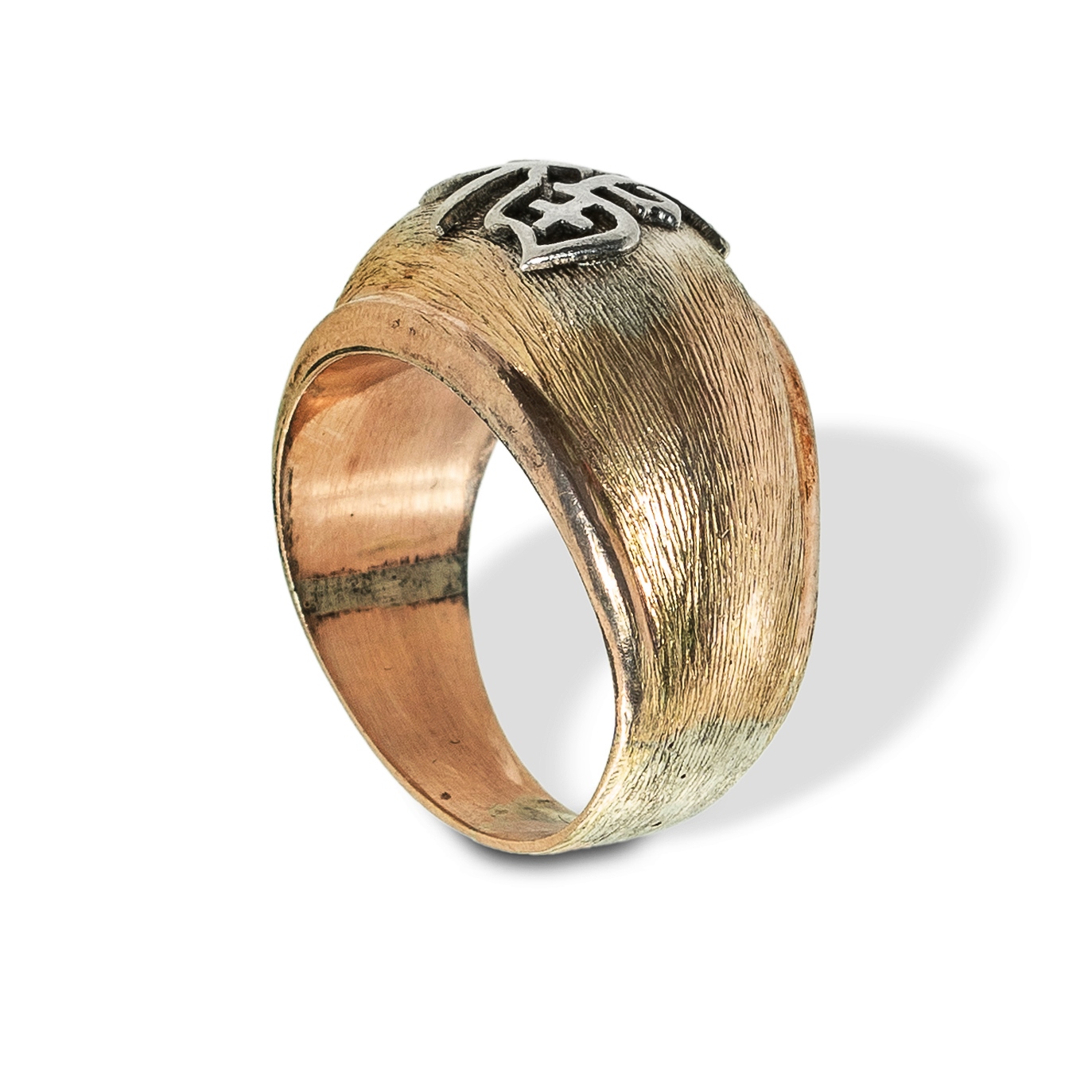 14ct Pink & White Gold Signet Ring Pink gold with textured gilt finish ring, with white gold characters applied (lead solder repair inside band). Acid test approx 14ct. Ring size K1/2 (approx) W6.69g (approx)Estimate $200-400