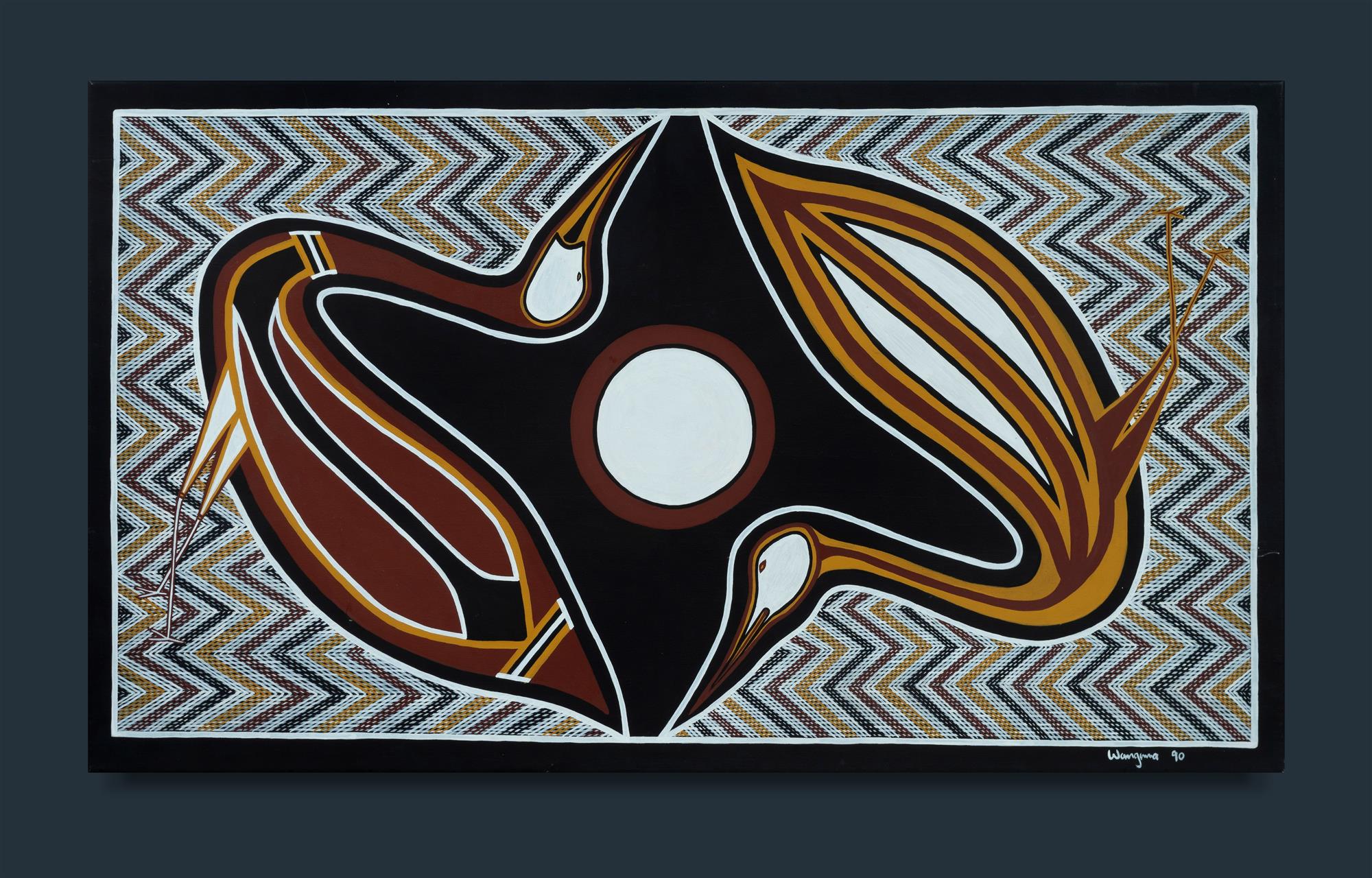 WANGURRA, Bruce Mantu (Aboriginal b.1953) 'Gayntjurr (Bower Bird)' 1990. Signed and inscribed with story verso. Acrylic on Canvas 50.5x87cm PROVENANCE: Emerald Hill Gallery, Melbourne, March 1990; private collection, USA.Estimate $250-450
