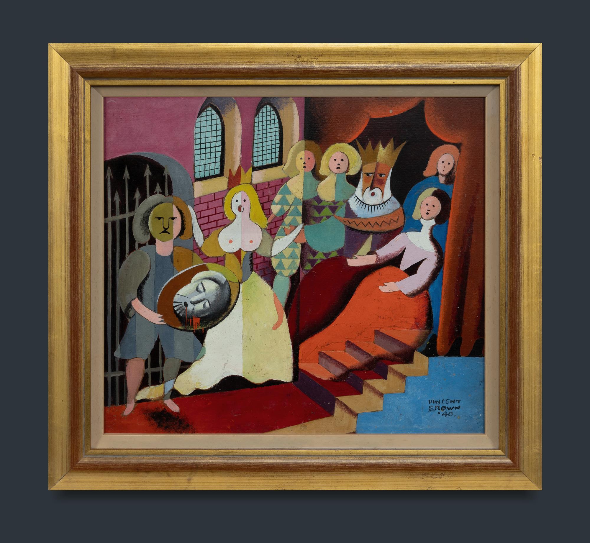 BROWN, Vincent (1901-2001) 'John the Baptist and Herodias,' 1940. Inscribed verso with title, and catalogue no.34 Oil on Board 34.5x39cmEstimate $500-800