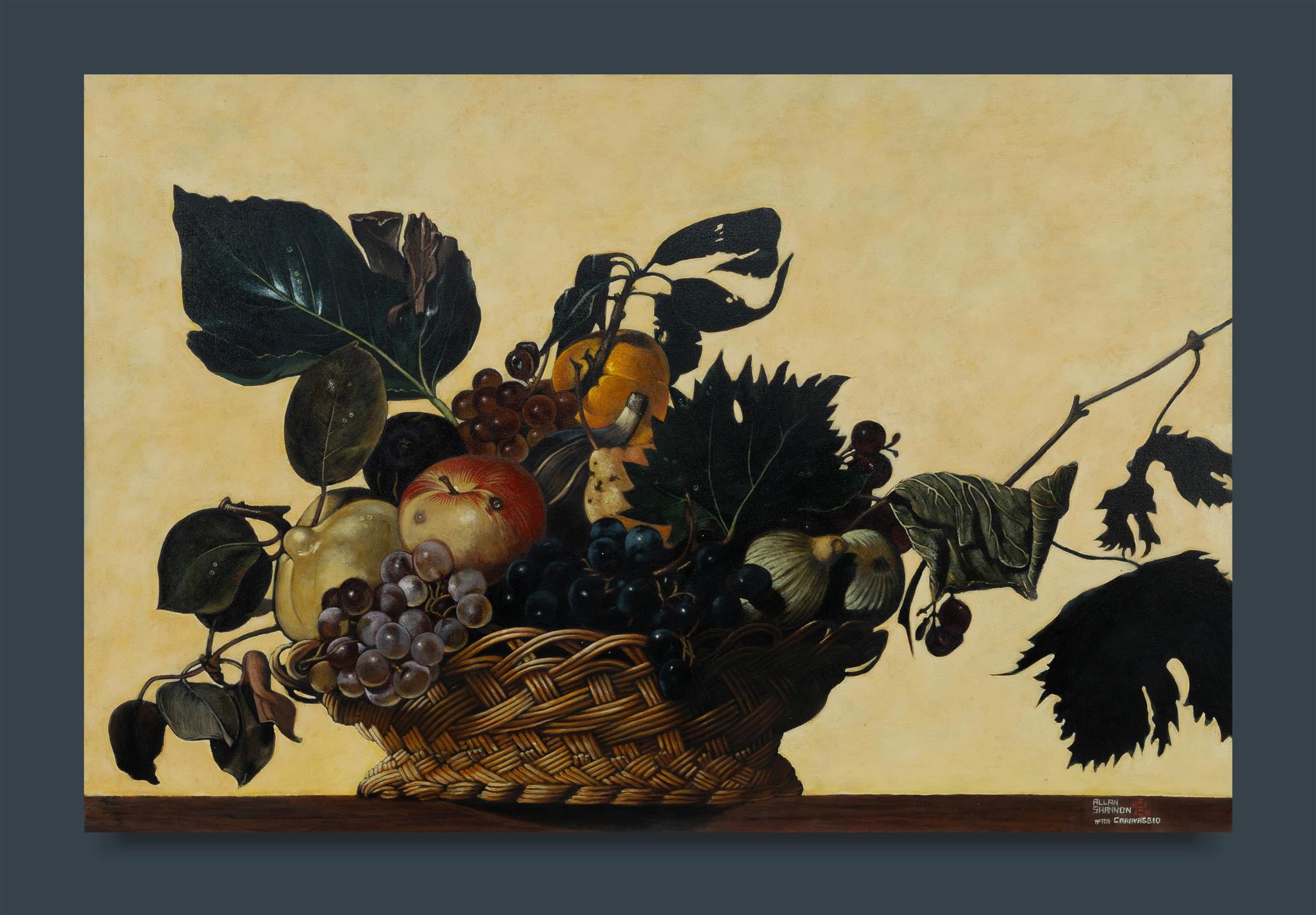 SHANNON, Allan Basket of Fruit, After Caravaggio. Oil on Canvas 61x91cm PROVENANCE: Darcy's Restaurant, Paddington, Sydney (proprietor Attilio Marinangeli) This work formed part of the collection on display there prior to its closure.Estimate $200-300