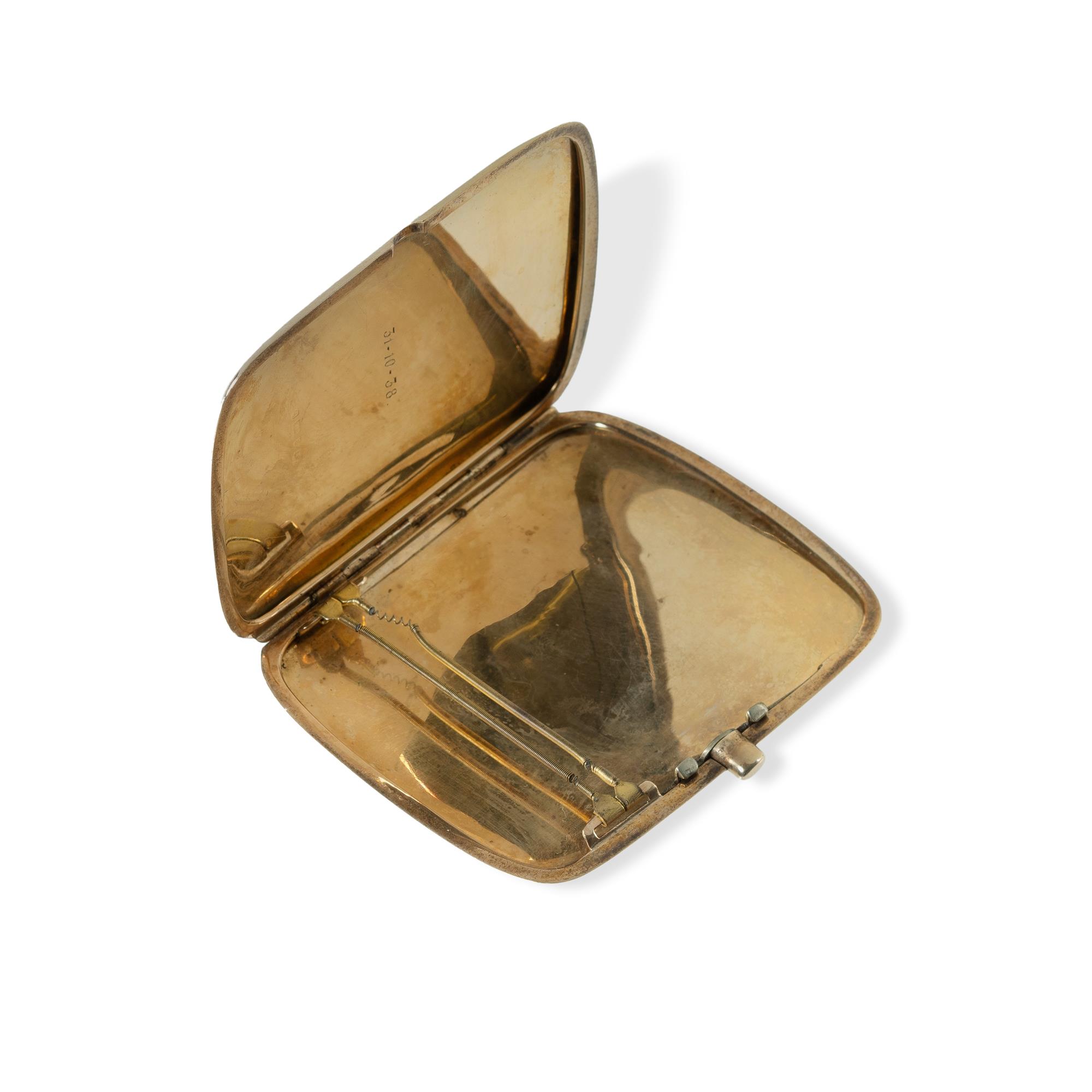 9ct Pink Gold Hallmarked Cigarette Case HM Birmingham (date mark rubbed). Inscribed ''31-10-38". 85x75mm (approx) W85.8g (approx)Estimate $2,500-3,750