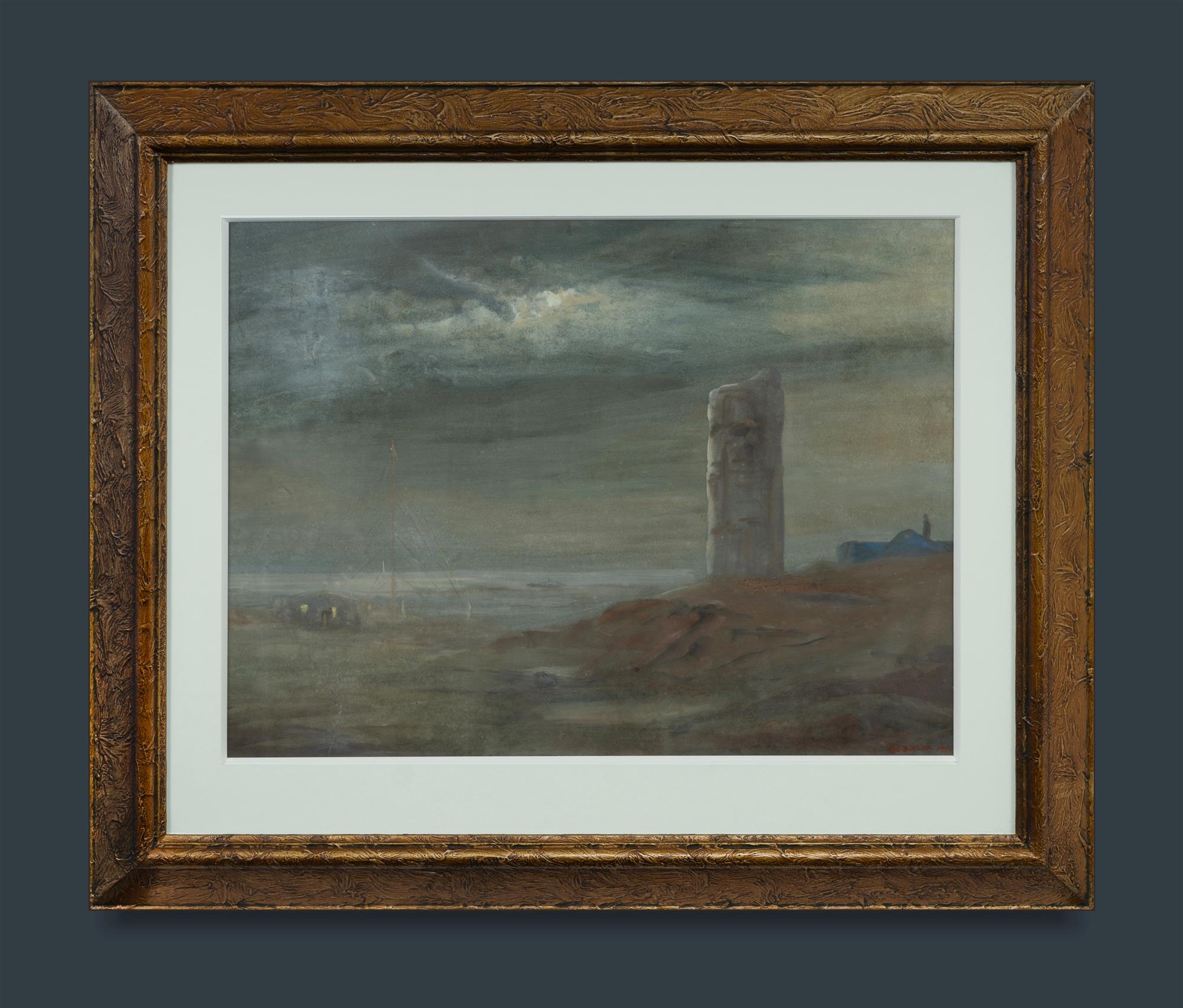 BUTLER, George Edmund (Britain/New Zealand 1870-1936) Flamborough Head, England, 1917 Signed lower right. Inscribed verso: Painted during Great War / Flamborough Head, England, with man-of-war standing off head and Danish watch tower in foreground. W/Clr & Gouache 43.5x59cm