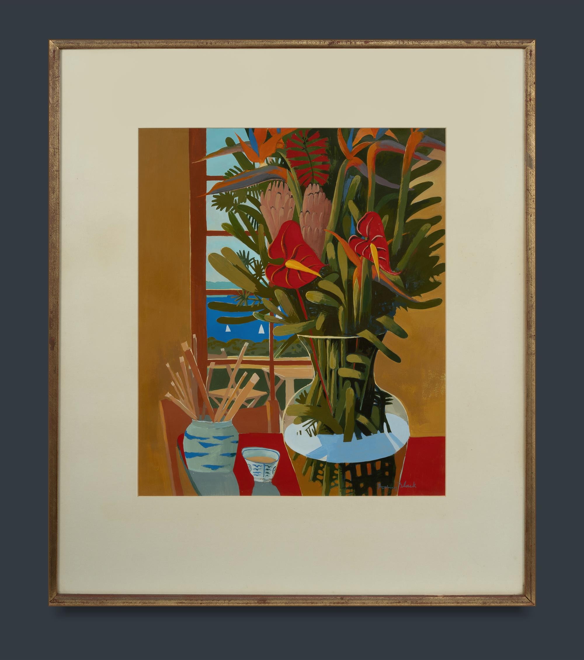 BLACK, Rodney (b.1947) Red Anthurium, Protea and Bird of Paradise Flowers in Glass Vase. Gouache 53x44.5cmEstimate $80-150