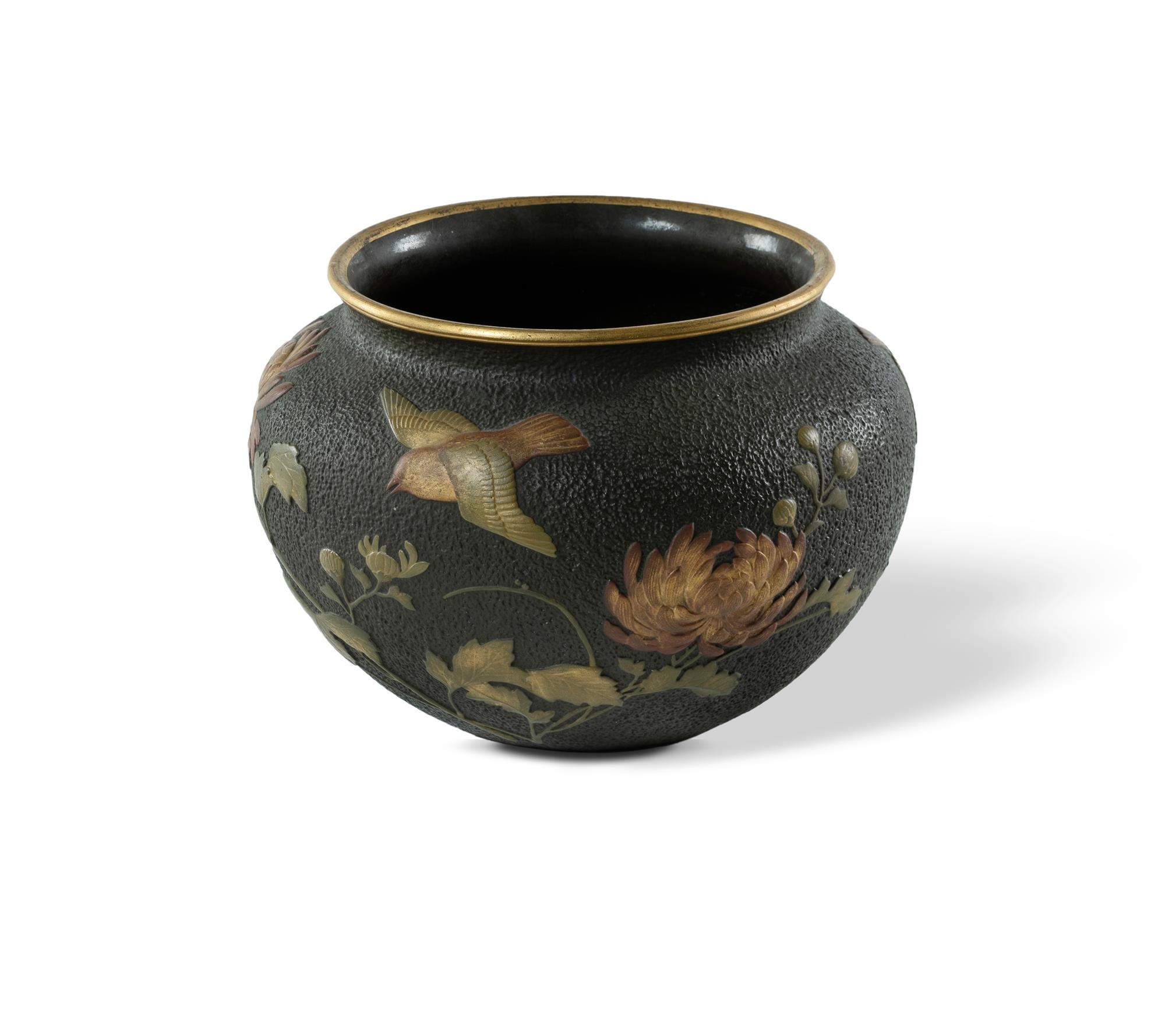 19th C Mintons Japanesque Jardiniere Simulated bronze finish with raised gilt birds and flowers. Circa 1886. (H17cm Dia.25cm)