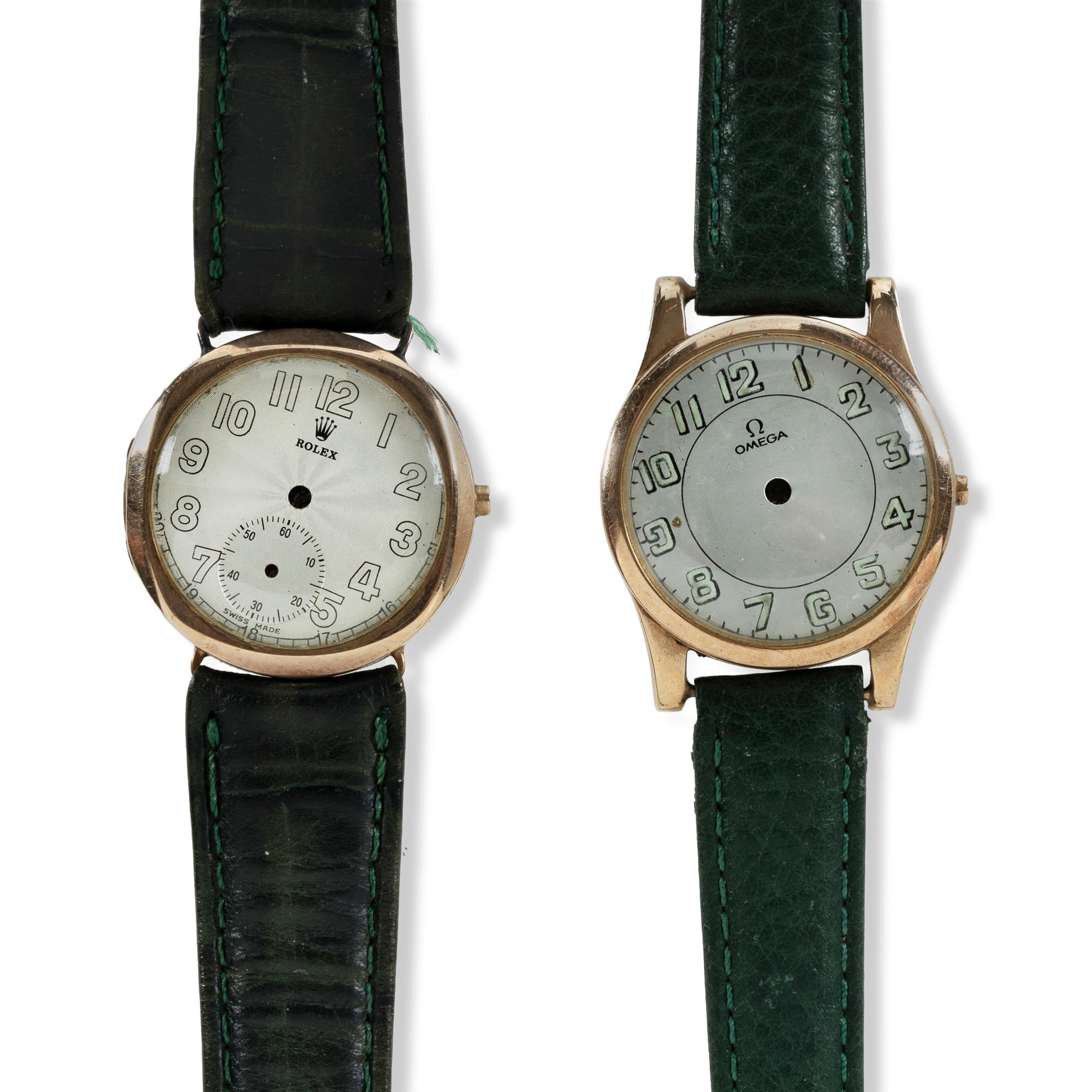 Rolex and Omega Watches and Cases Includes Rolex signed 28mm 9ct gold case and new dial; Omega signed 28mm 9ct gold case and new dial; Rolex pocket watch, stem wind gold-filled case engraved 1912 with later? 15 jewel movement, unsigned Arabic dial with fine hairlines, running, no hands or crystal; and Omega pocket watch, thin stainless cased 15 jewel movement, running.