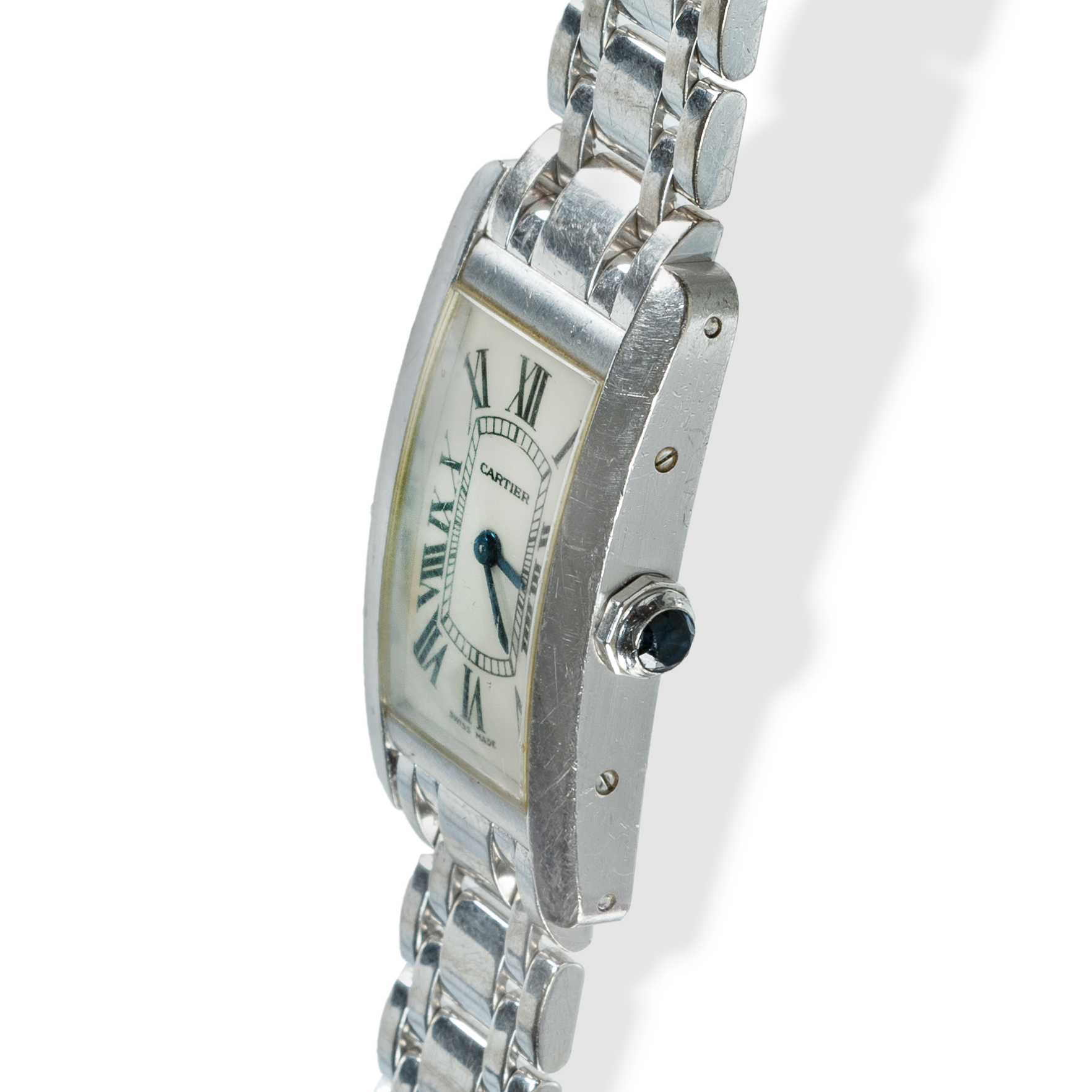 18ct White Gold Ladies Cartier Tank Americaine 18ct case and band Cartier Tank Américaine ladies wristwatch.Estimate $4,500-7,000